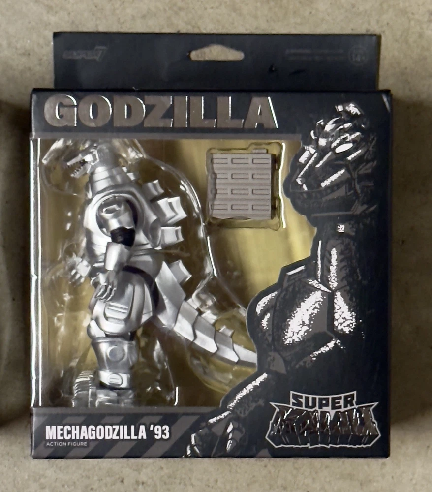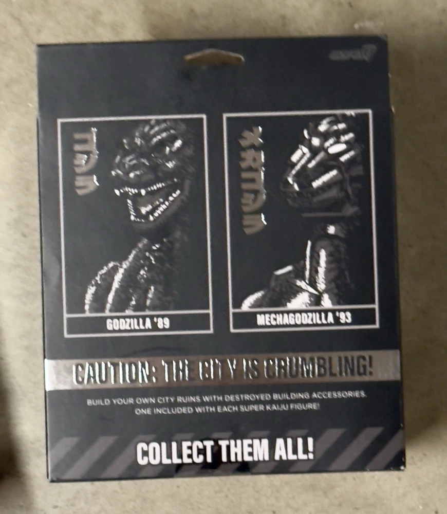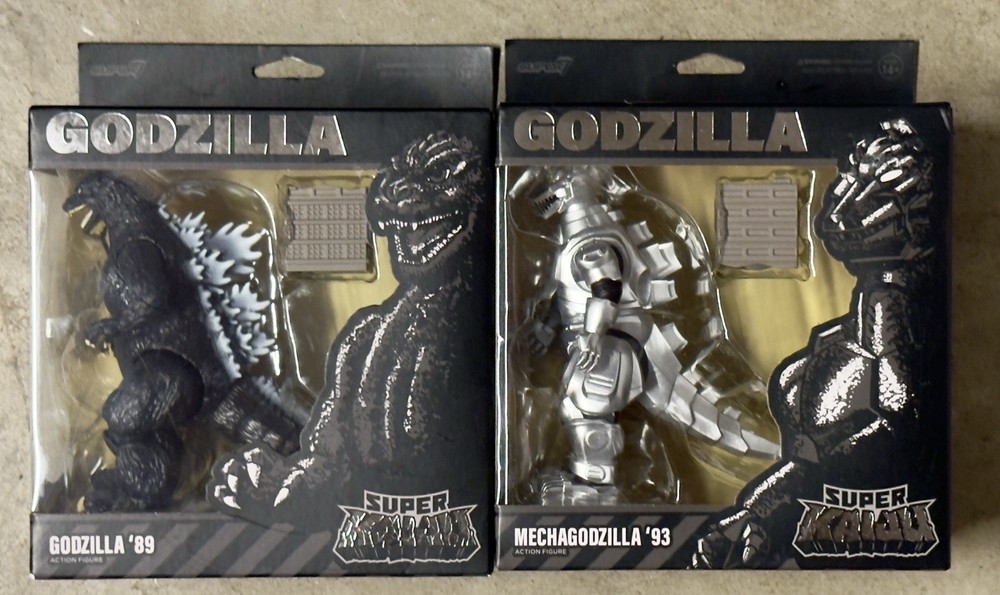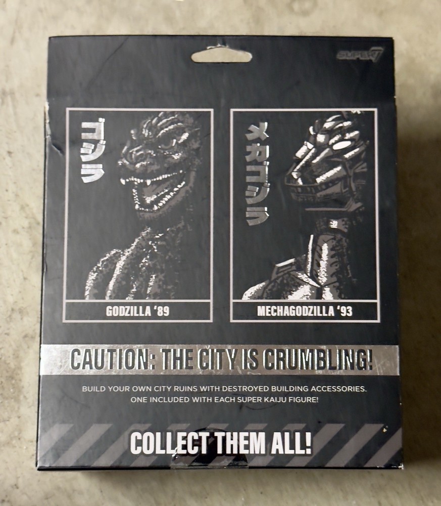 Get ready to battle it out with these Super7 Kaiju Godzillas! This set includes a '89 Deluxe Super Kaiju Godzilla and a '93 Mechagodzilla. Both come in damaged boxes, but that won't stop you from displaying them proudly. These figures are perfect for collectors and fans of the Godzilla franchise. The attention to detail is remarkable and will make a great addition to any collection. Don't miss your chance to own these iconic monsters.