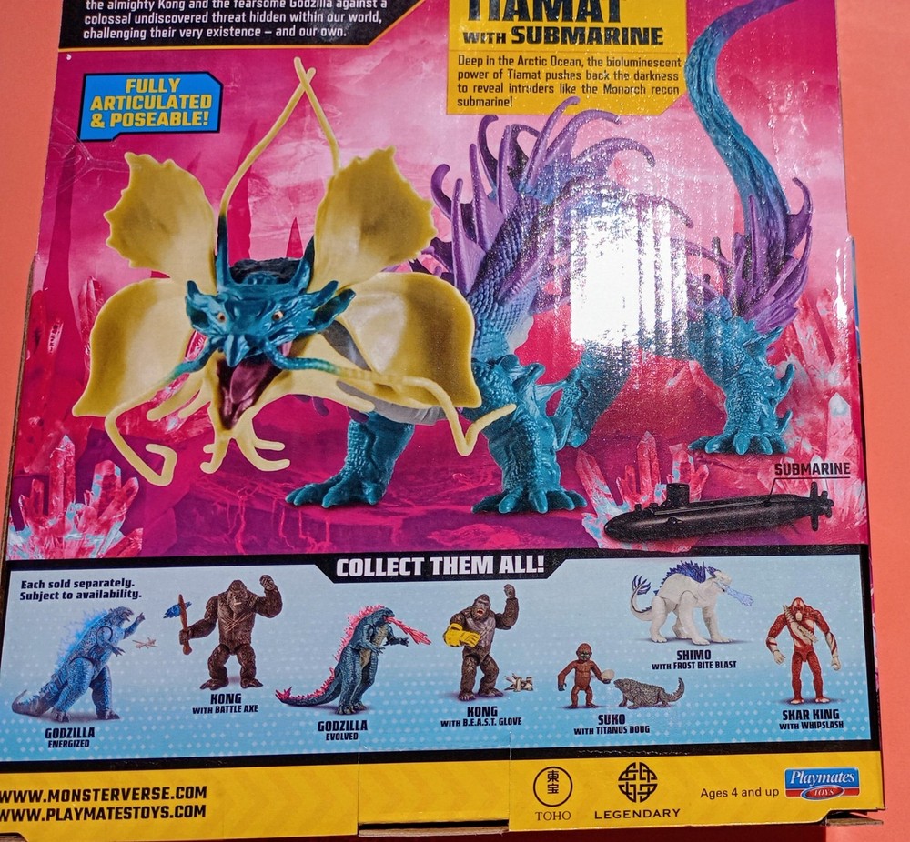 The product is a Tiamat action figure from the Godzilla vs Kong: The New Empire movie, part of the Monsterverser toy line by Playmates Toys. This plastic figure comes with a submarine accessory and is about 6 inches long. Targeted at ages 4 and up, this collectible toy is themed around the Godzilla franchise and is packaged in its original, unopened packaging. Perfect for fans of action figures and movie-themed toys, this Tiamat figure is a must-have for any Godzilla enthusiast.