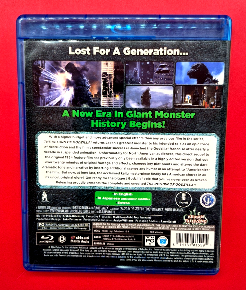 The Return of Godzilla - Godzilla 1984 (Blu-ray) Used but in very good to like new condition. Case has some light wear, disc is in Like New Condition. See pics for what is included and overall condition. Any questions please feel free to ask. Combined shipping is available. Any Digital Codes are not guaranteed to work. All items are photographed and video recorded during packing process for Seller and Buyer protection. All orders not paid within 4 days are automatically cancelled. Thank you for looking and Stay Safe. (All instances of fraud are reported to the home city of the Buyers Police Dept. and Internet Crime Complaint Center)