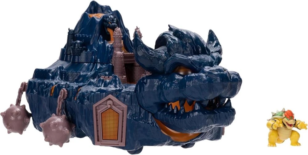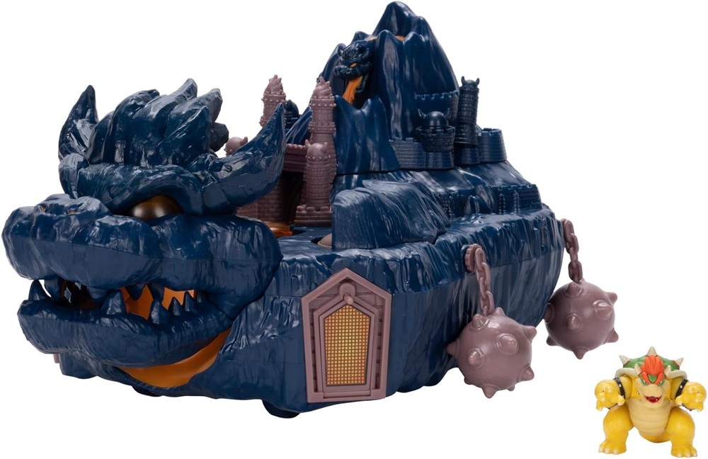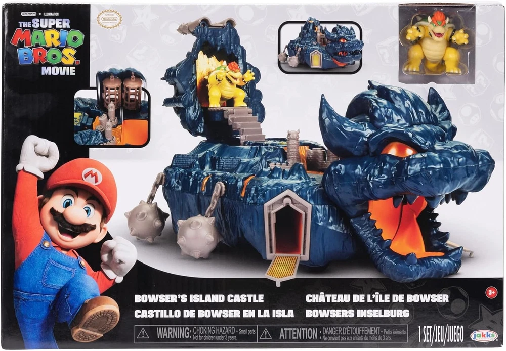 The Super Mario Bowser Island Castle Playset with 2.5” Bowser Action Figure & Interactive Pieces Product Details Product Dimensions: 4.02 x 9.02 x 12.99 inches Item Weight: 1.1 pounds Country of Origin: China Item model number: 418044 Manufacturer recommended age: 36 months - 6 years Release date: August 1, 2023 Language: English Manufacturer: Jakks Pacific Inc. The Super Mario Bros. Movie Bowser's Island Castle playset with exclusive 1.25” Bowser figure Inspired by Bowser's Island Castle from the movie Top opens to reveal Bowser's throne Interactive features include jails cells that can be lifted or hidden, trap door for characters to escape through the side hatch and rolling wheels Suggested for kids boys girls ages 3 and up Behold the King of the Koopas! Featuring the exclusive Bowser figure, Bowser's Island Castle playset is as imposing as it is in The Super Mario Bros. Movie. Inspired by the movie, the playset's exterior has hanging mace balls around the perimeter and Bowser's iconic head molded into the front with opening jaw for characters to pass through. The highest point opens to reveal Bowser's throne from where Bowser can overlook the expanse. Interactive features include jails cells that can be lifted or hidden as well as a trap door for characters to escape through the side hatch. With hidden rolling wheels this is the perfect playset for fans to relive and recreate many of Bowser's scenes from the movie. - Exclusive Bowser figure - Bowser's Island Castle from the movie - Top opens to reveal Bowser's throne - Interactive features include jails cells that can be lifted or hidden, trap door for characters to escape through the side hatch and rolling wheels - Ages 3+