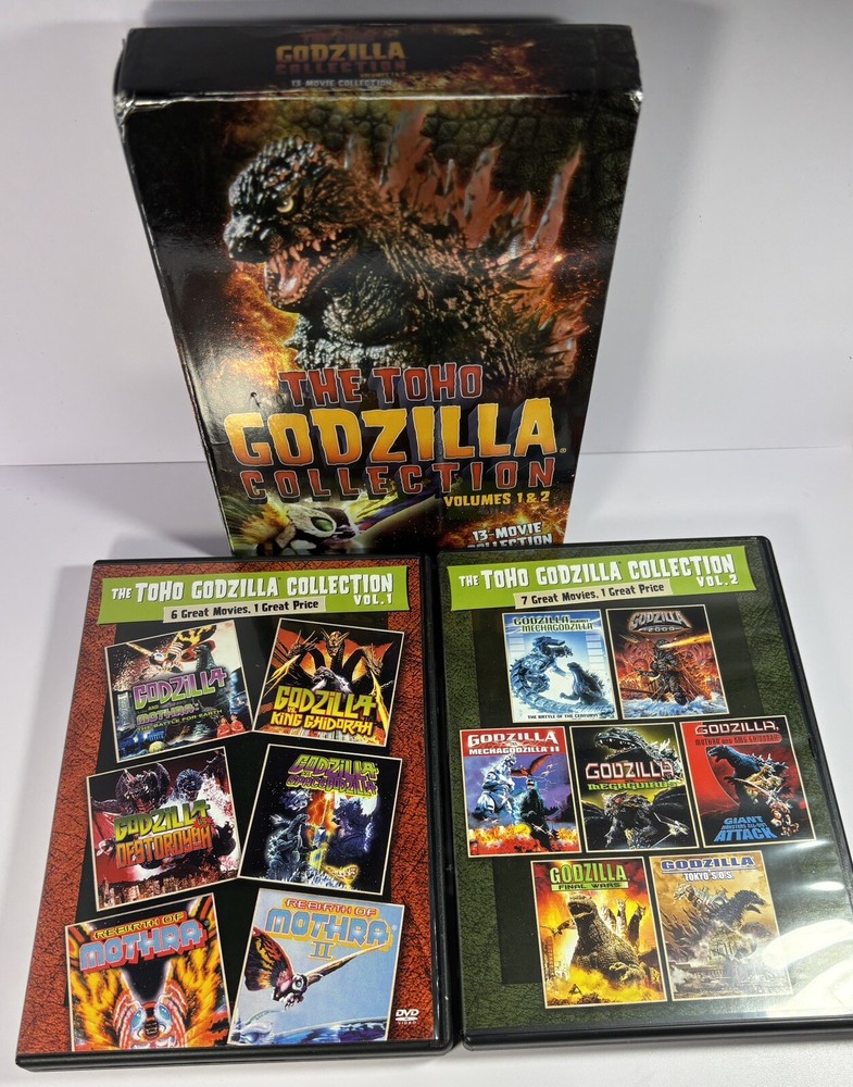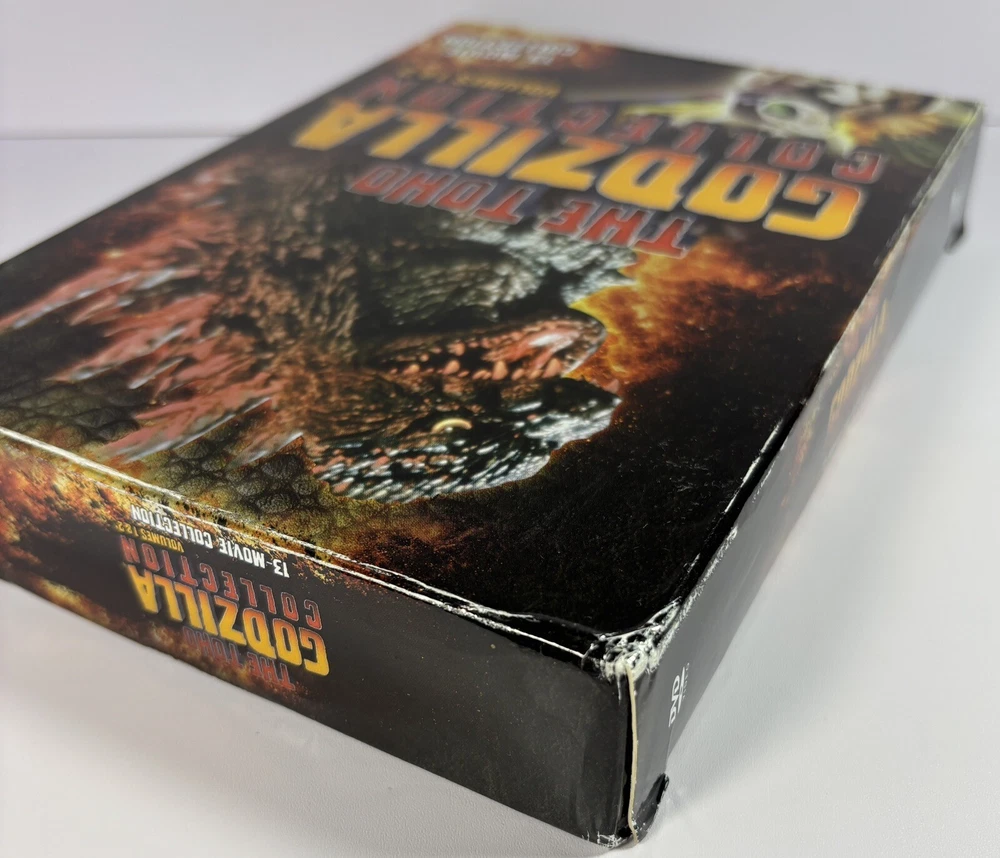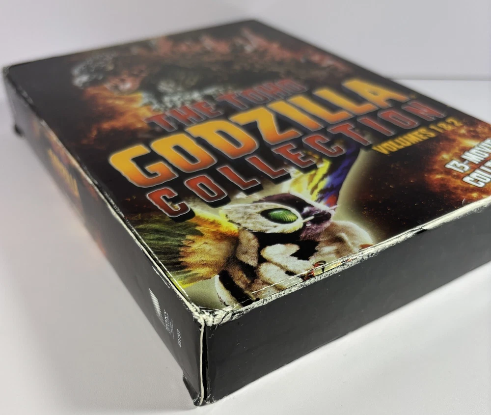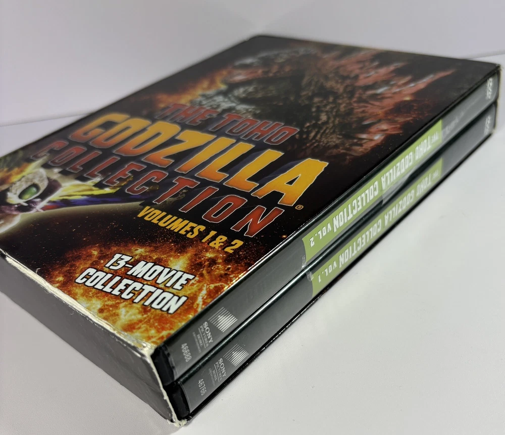 NEWSAGENT'S DESCRIPTION This listing is for the rare 7-Disc DVD Box Set of The Toho Godzilla, Vol 1 & 2. This 13-Movie Collection was released by Sony Pictures in 2016. The outer case exhibits some shelf wear, including edge and corner bumping (see pictures). Item Grading : VG+ (See Grading Guide below) Please contact us if you need additional details. We're happy to combine shipping for multiple purchases. Thank you for looking! Grading Guide Brand New (New) An item that has never been opened or removed from the manufacturer's seal. Mint (M) A pre-owned item that appears brand new. The disc is in perfect condition with no visible wear, scratches, or scuffs. The case and inserts are in excellent condition with no pressure marks, tears, or damage. While the case may show extremely light shelf wear, such as minor scuffs, it is otherwise flawless. Very Good (VG) This is a used item in excellent working condition with minimal signs of wear. The disc may have very light scuffs that do not affect playback. The case and inserts are free of cracks, tears, or holes but may show light scuffs or wear. All cover art and inserts are included. Good (G) A used item that functions as intended but shows moderate wear. The disc may have noticeable scuffs or light scratches but remains fully playable. The case and inserts may show scuffs, minor cracks, or other signs of wear. Some inserts or cover art may be missing, but major elements are present. Acceptable (A) This is a heavily used item with visible wear and potential cosmetic or functional issues. The disc may have multiple scuffs or scratches but still plays through without skipping. The case and inserts may show significant wear, including scuffs, cracks, broken hub teeth, or missing parts. Cover art or inserts may be incomplete or absent.