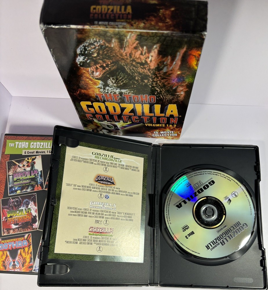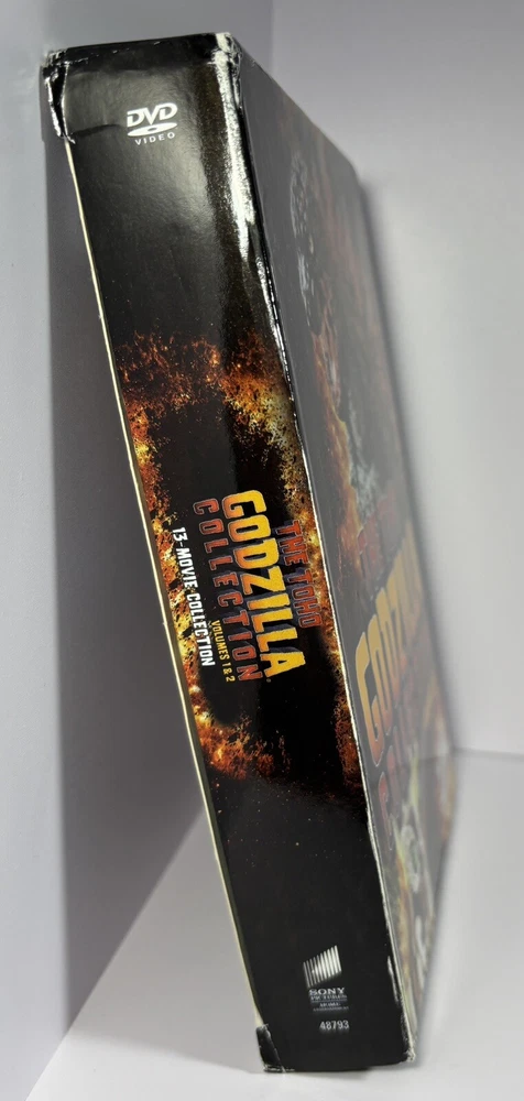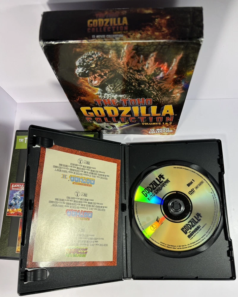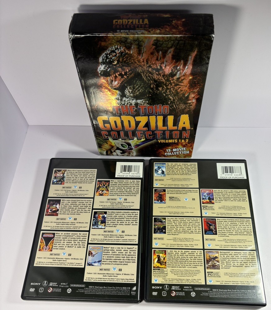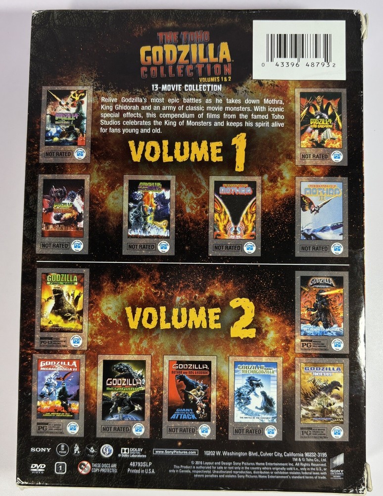NEWSAGENT'S DESCRIPTION This listing is for the rare 7-Disc DVD Box Set of The Toho Godzilla, Vol 1 & 2. This 13-Movie Collection was released by Sony Pictures in 2016. The outer case exhibits some shelf wear, including edge and corner bumping (see pictures). Item Grading : VG+ (See Grading Guide below) Please contact us if you need additional details. We're happy to combine shipping for multiple purchases. Thank you for looking! Grading Guide Brand New (New) An item that has never been opened or removed from the manufacturer's seal. Mint (M) A pre-owned item that appears brand new. The disc is in perfect condition with no visible wear, scratches, or scuffs. The case and inserts are in excellent condition with no pressure marks, tears, or damage. While the case may show extremely light shelf wear, such as minor scuffs, it is otherwise flawless. Very Good (VG) This is a used item in excellent working condition with minimal signs of wear. The disc may have very light scuffs that do not affect playback. The case and inserts are free of cracks, tears, or holes but may show light scuffs or wear. All cover art and inserts are included. Good (G) A used item that functions as intended but shows moderate wear. The disc may have noticeable scuffs or light scratches but remains fully playable. The case and inserts may show scuffs, minor cracks, or other signs of wear. Some inserts or cover art may be missing, but major elements are present. Acceptable (A) This is a heavily used item with visible wear and potential cosmetic or functional issues. The disc may have multiple scuffs or scratches but still plays through without skipping. The case and inserts may show significant wear, including scuffs, cracks, broken hub teeth, or missing parts. Cover art or inserts may be incomplete or absent.
