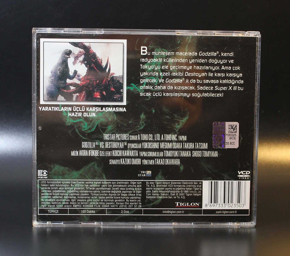 Godzilla Movies Turkish DUB Video CD Set of 3 - Mothra vs. Godzilla (1964) - Godzilla vs. Spacegodzilla (1994 - Godzilla vs. Destoroyah (1995) Format: VCD / Video CD (consists of 2 discs) Year: 1964 / 1994 / 1995 Audio: Turkish - No Subtitles. Condition : All cases and Movie discs like new condition. (only Spacegodzilla disc-1 good condition) All discs tested. Please Click to See my other VCD Animations or DVD Fantastic Movies .------------------------------- - Shipping with Registered Trackable Post - International arrived time: 2-3 weeks - Dear Users, also Expedited Shipping available (3-7 days) If you don't see expedited shipping costs about your country, please contact me. - All my listings have Actual item pictures. Please review all photos for accurate item condition Will ship with extra care and good packaging - International Buyers, Pls Note: it is your responsibility, as a buyer, to pay all customs fees, duties, import taxes and related charges. Please check with your country's customs office to determine what these additional costs will be prior to bidding or buying.