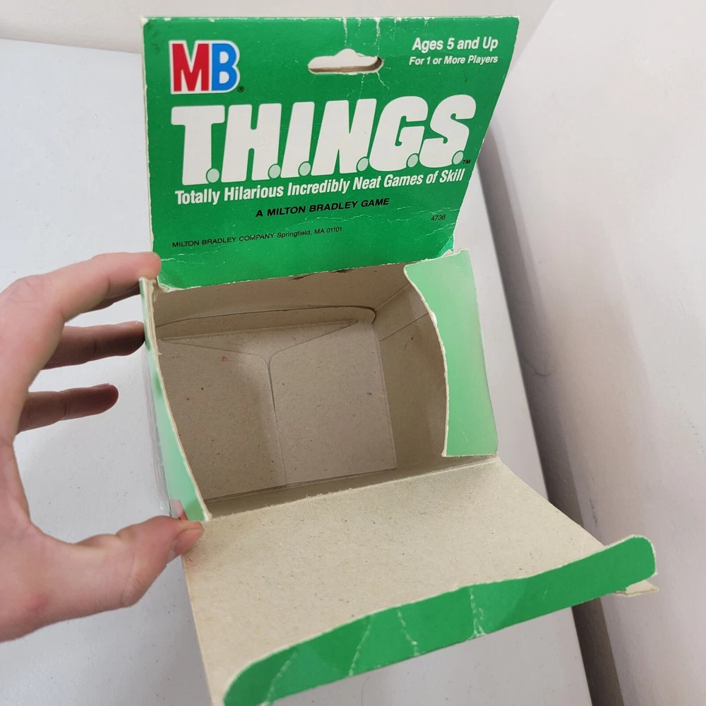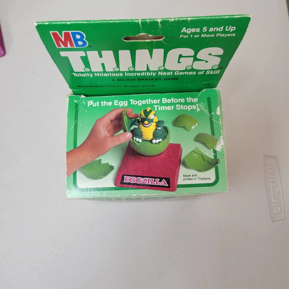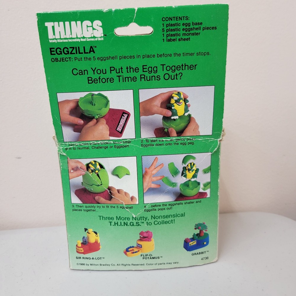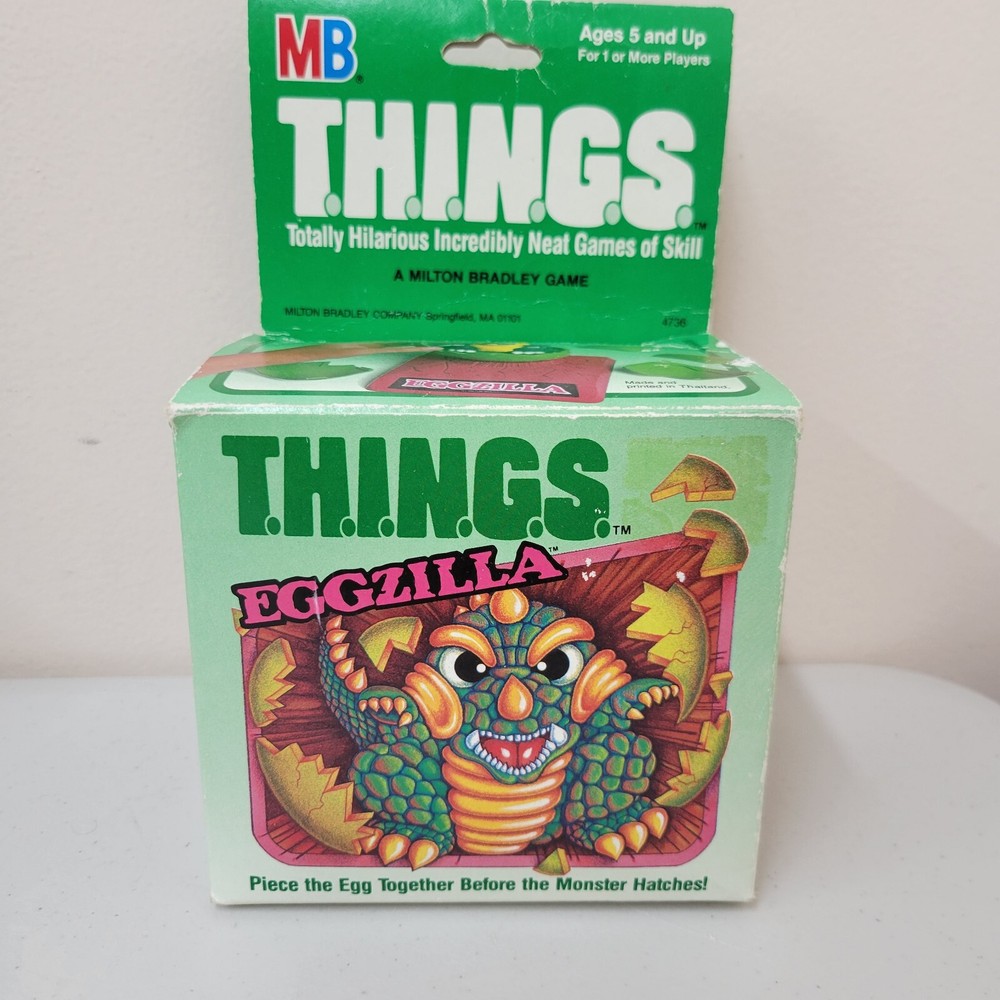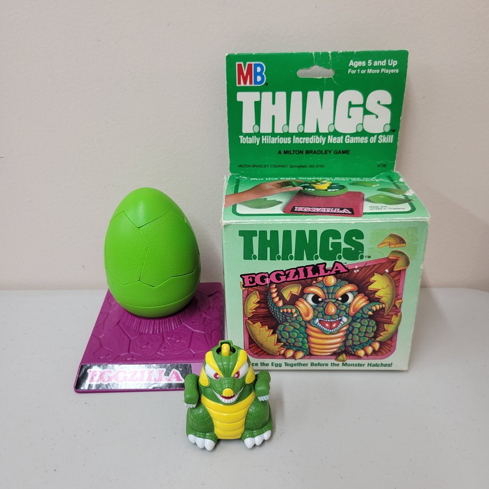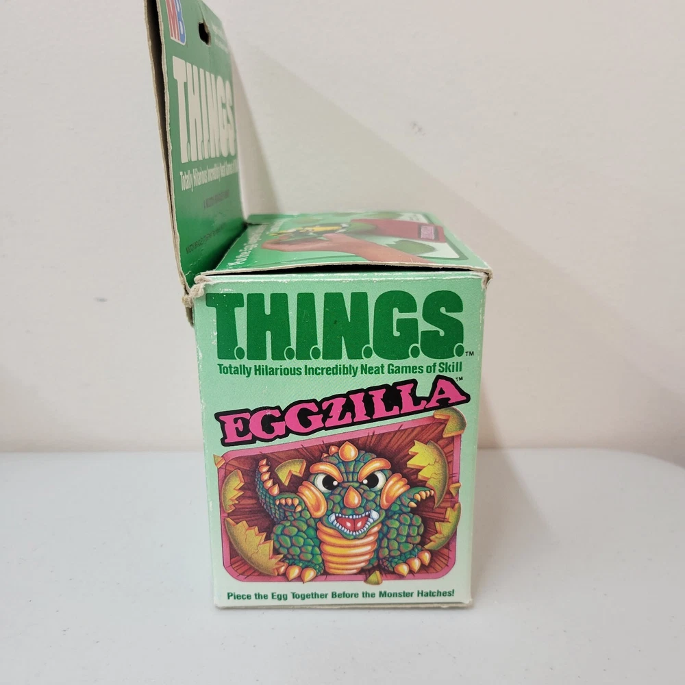 Vintage MB THINGS Eggzilla Skill Game Godzilla Clone Rare Not Working boxed. In good condition with normal wear. Box has wear and damage including rips, tears, missing art, stickers and tape, bending, etc. The game pieces are in good condition with normal wear. The sticker that says eggzilla is off to the left of where it's sussposed to be (as seen in pictures). I could not get the game to work properly most of the time the timer would go down in less Than a second or get stuck and refuse to go down. Again this item is not working and is sold for parts or repair. You will recieve exactly what you see. Sold as is with no returns. Thanks for looking.