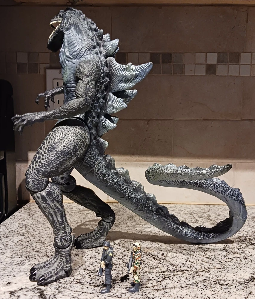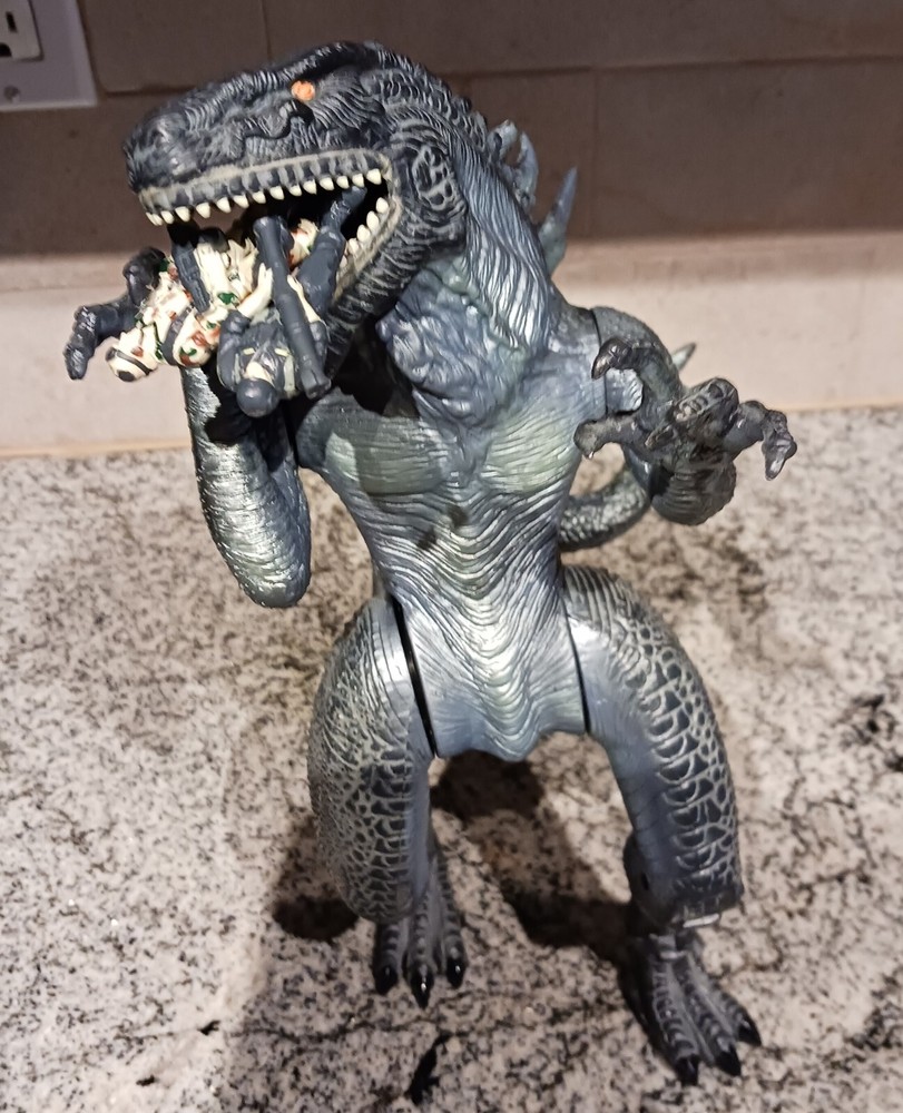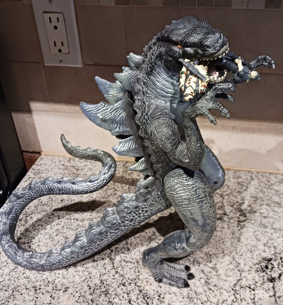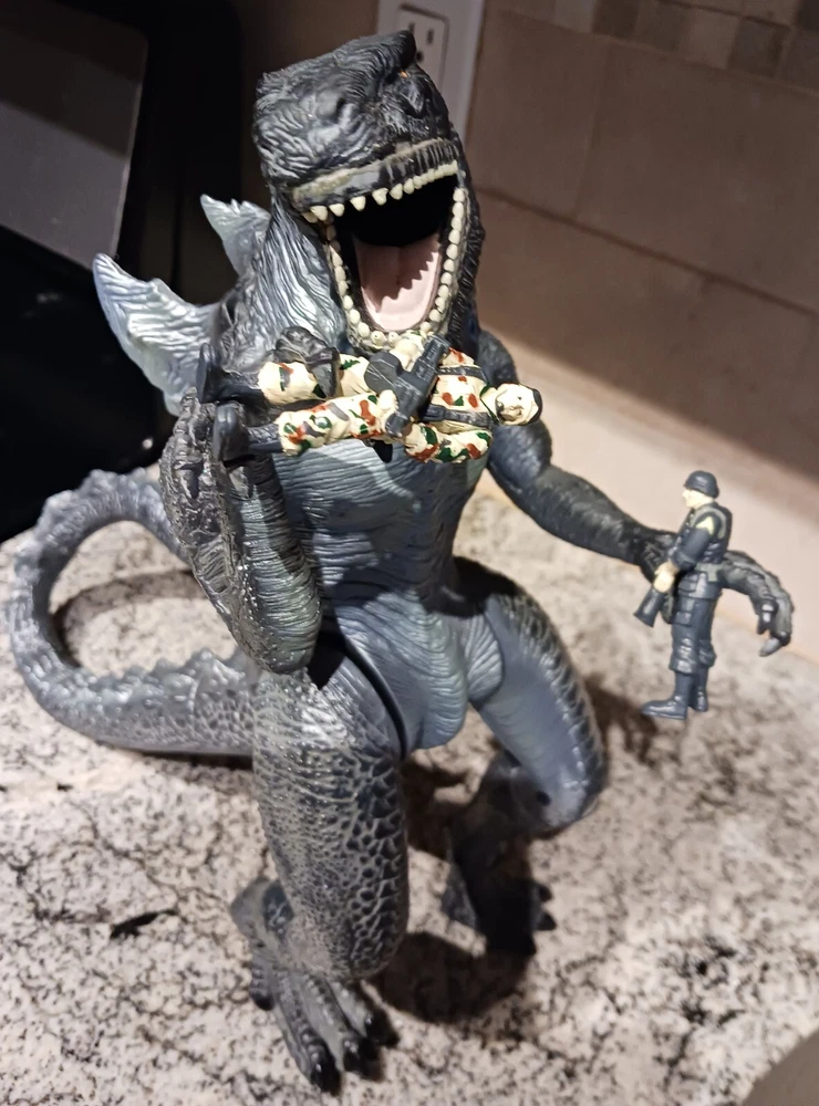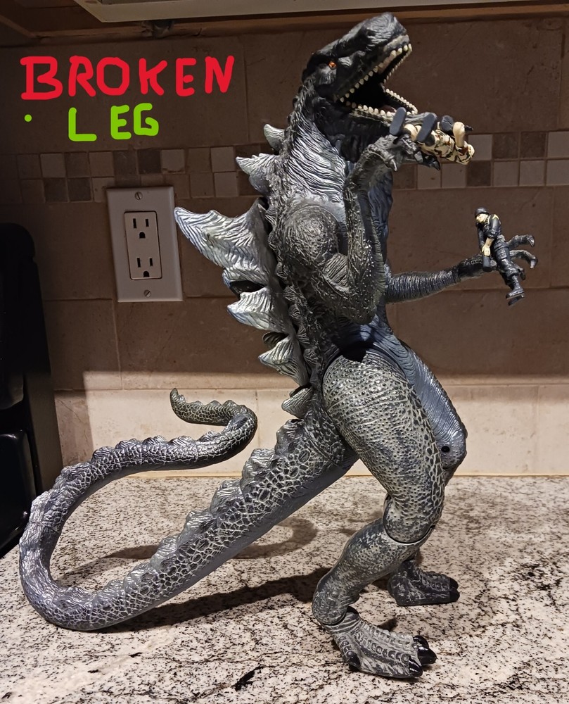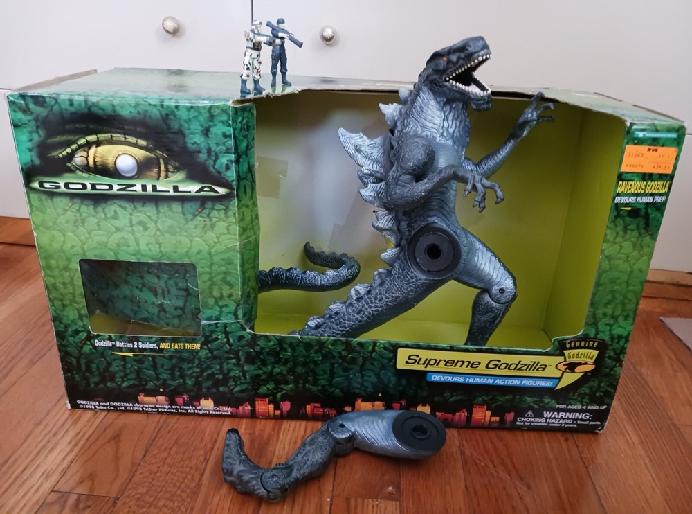 Vintage Toho Trendmasters 1998. Supreme Godzilla 14'' Figure Devours Human Action Figures with 2 Soldiers with Box. Large Godzilla has a broken leg and the frame for the figures compartment is split. See the last 3 photos.. Box has wear. 3.6 22 12 8 40D