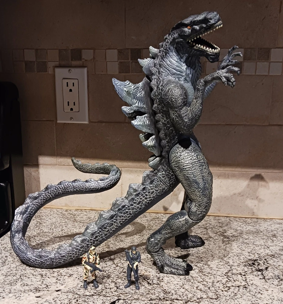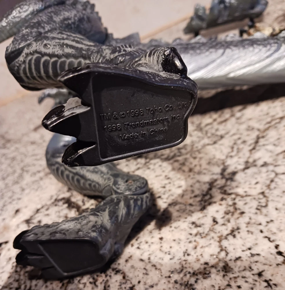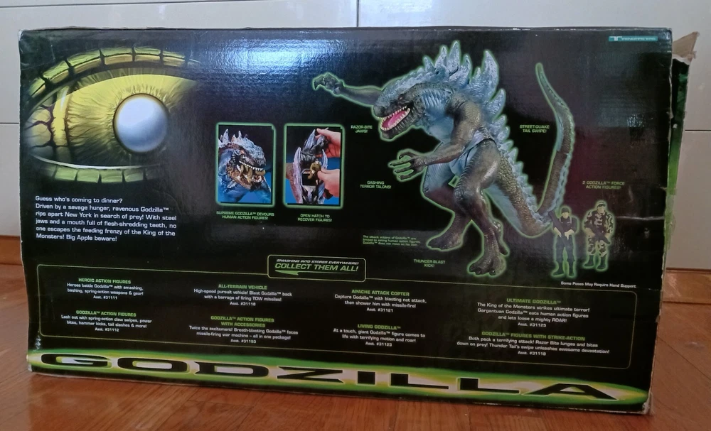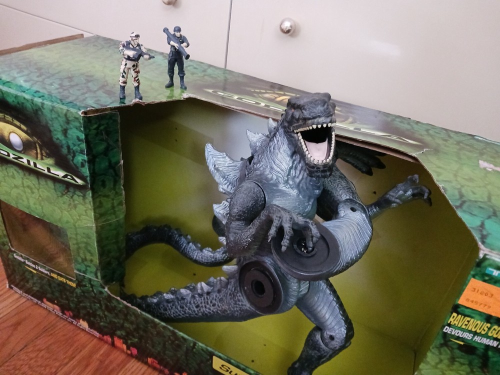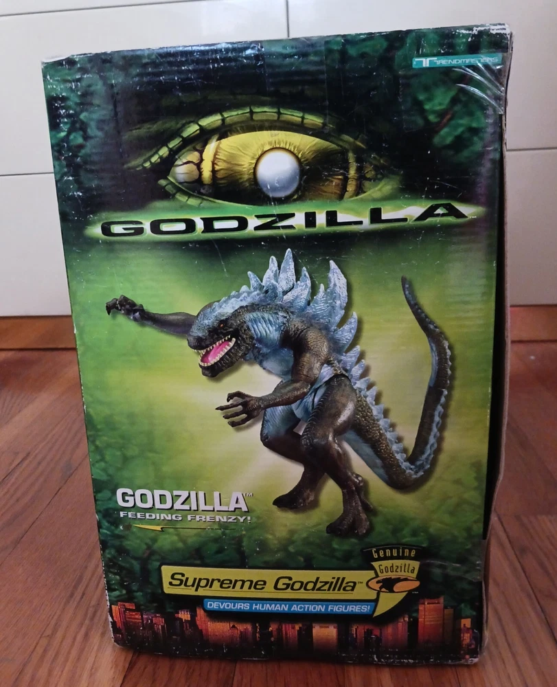 Vintage Toho Trendmasters 1998. Supreme Godzilla 14'' Figure Devours Human Action Figures with 2 Soldiers with Box. Large Godzilla has a broken leg and the frame for the figures compartment is split. See the last 3 photos.. Box has wear. 3.6 22 12 8 40D
