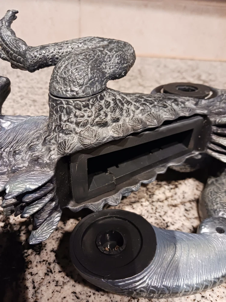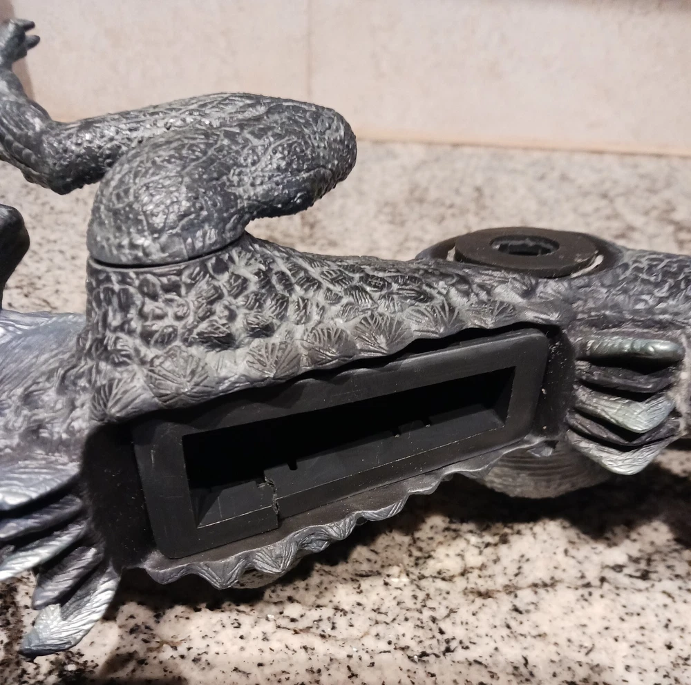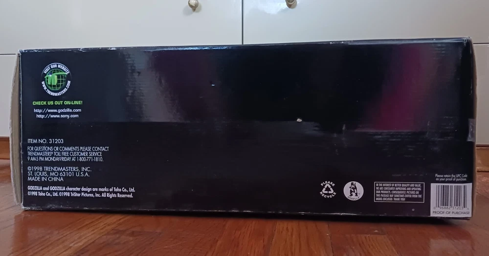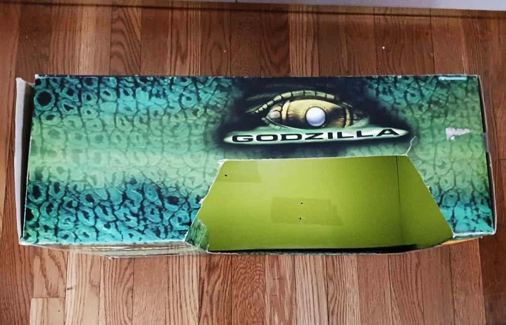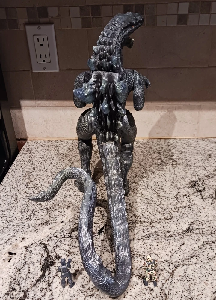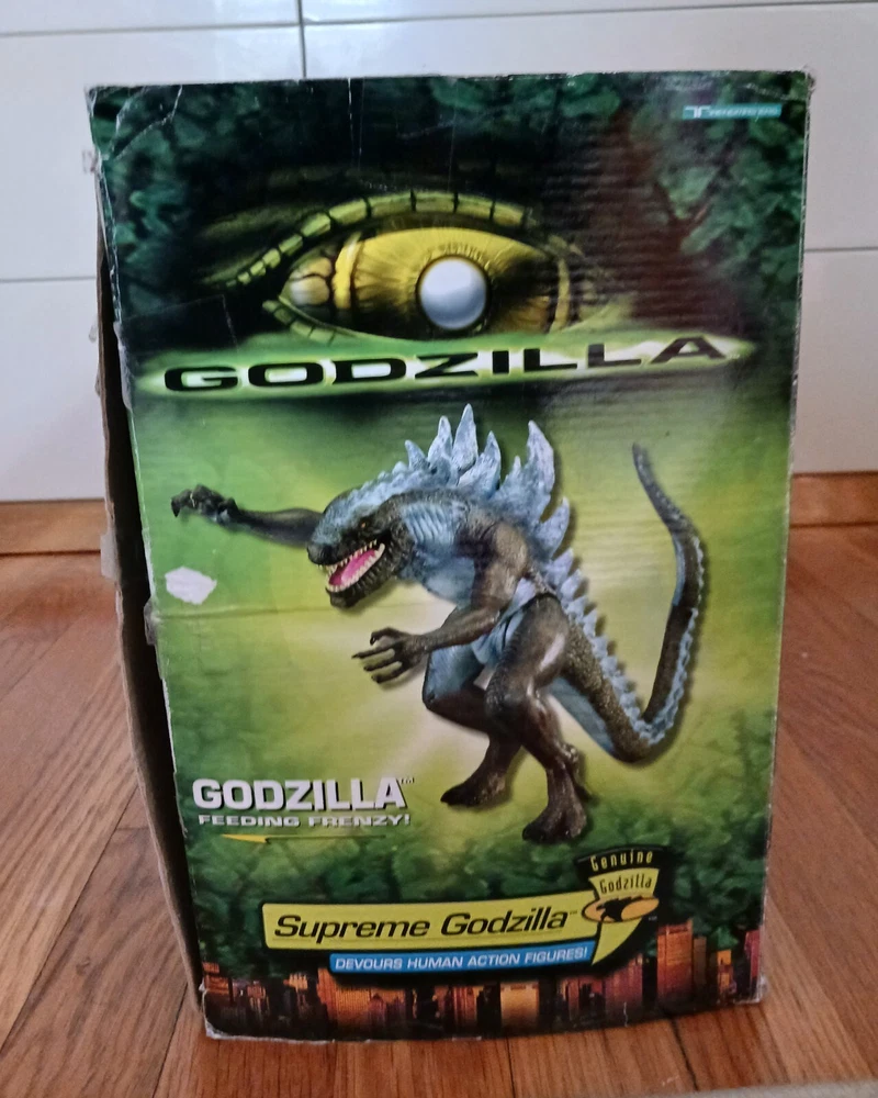 Vintage Toho Trendmasters 1998. Supreme Godzilla 14'' Figure Devours Human Action Figures with 2 Soldiers with Box. Large Godzilla has a broken leg and the frame for the figures compartment is split. See the last 3 photos.. Box has wear. 3.6 22 12 8 40D
