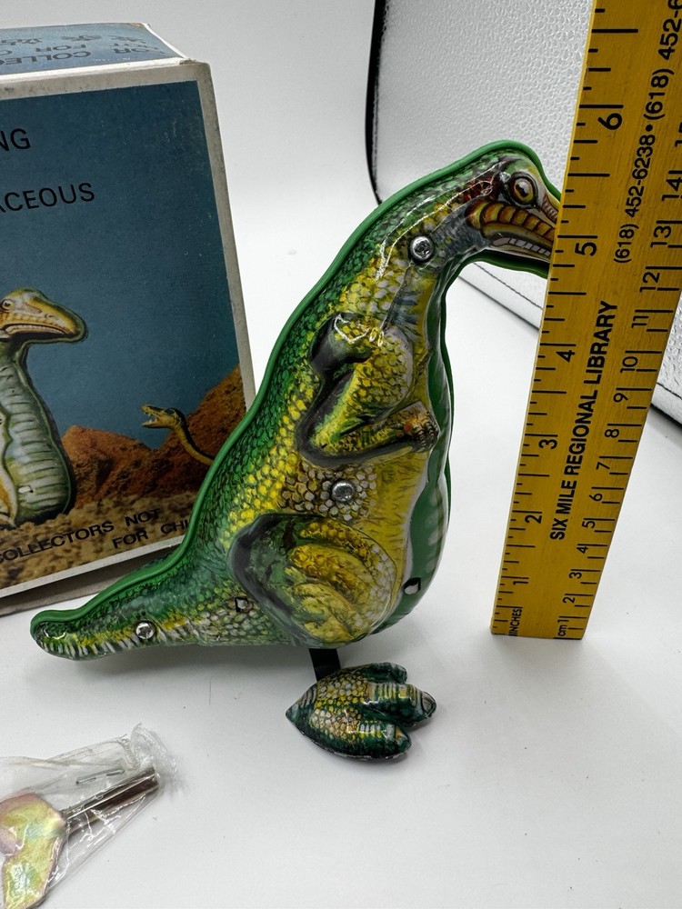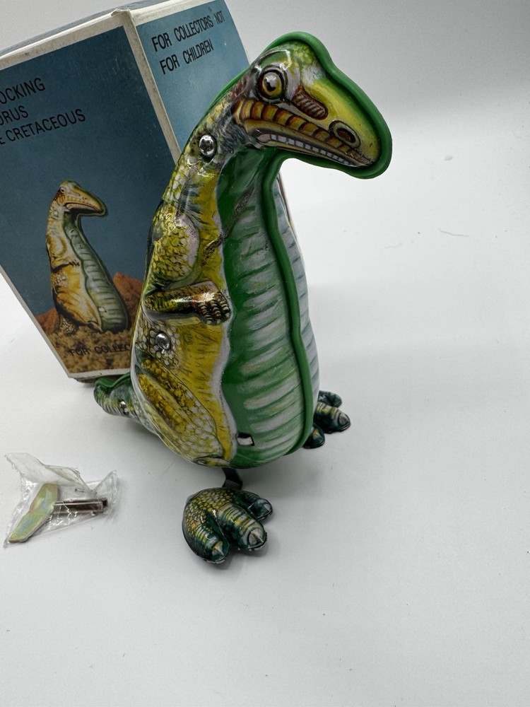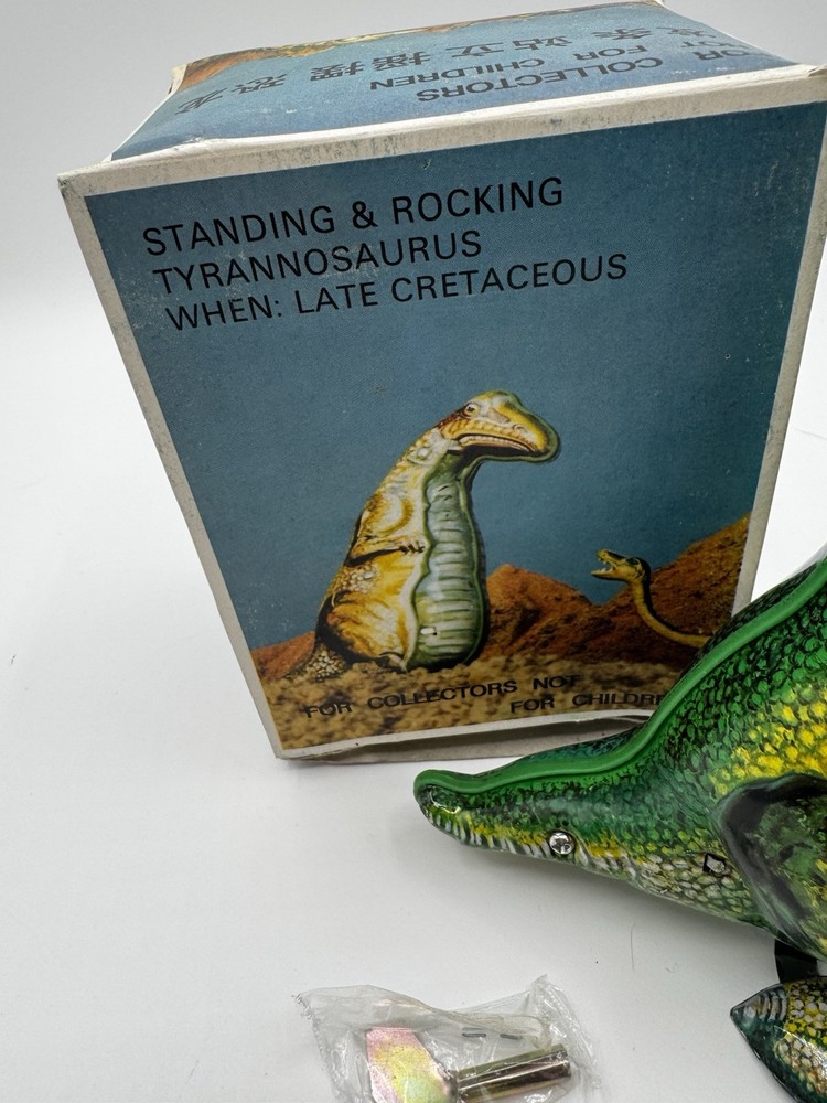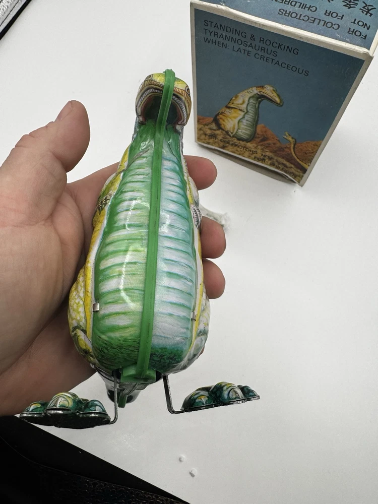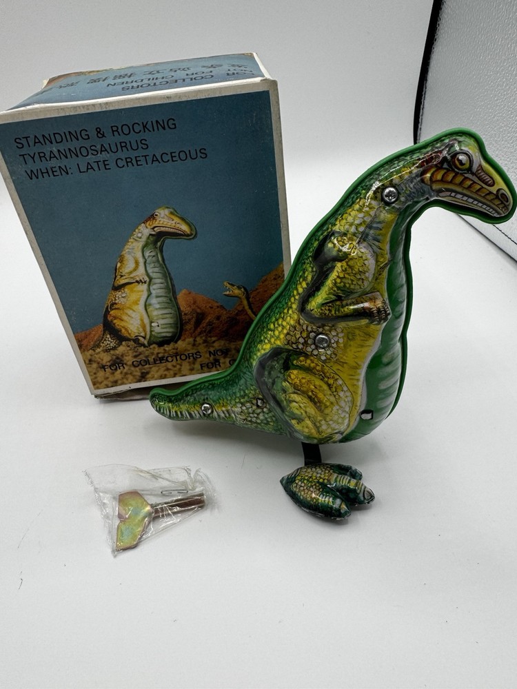 Just got this awesome wind-up T-Rex tin toy—mint condition and still in its original box! The dinosaur rocks and moves with such fun, quirky charm. The box has some wear, but who cares when the toy itself is flawless? Perfect for collectors or anyone who loves classic retro vibes. So cool to see it in action—brings back that childhood excitement! Highly recommend for Godzilla fans or vintage toy lovers.