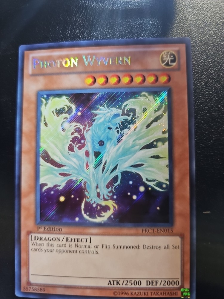 This is a rare and highly sought-after Yu-Gi-Oh! card featuring the powerful Photon Wyvern. It is a Secret Rare card from the 1st Edition set, with the card number PRC1-EN015. This card is sure to be a valuable addition to any collection, especially for fans of the Dragon creature type. The card is manufactured by Konami and is an Effect type card. It is perfect for players of the Yu-Gi-Oh! TCG game. Don't miss out on the opportunity to own this incredible card.