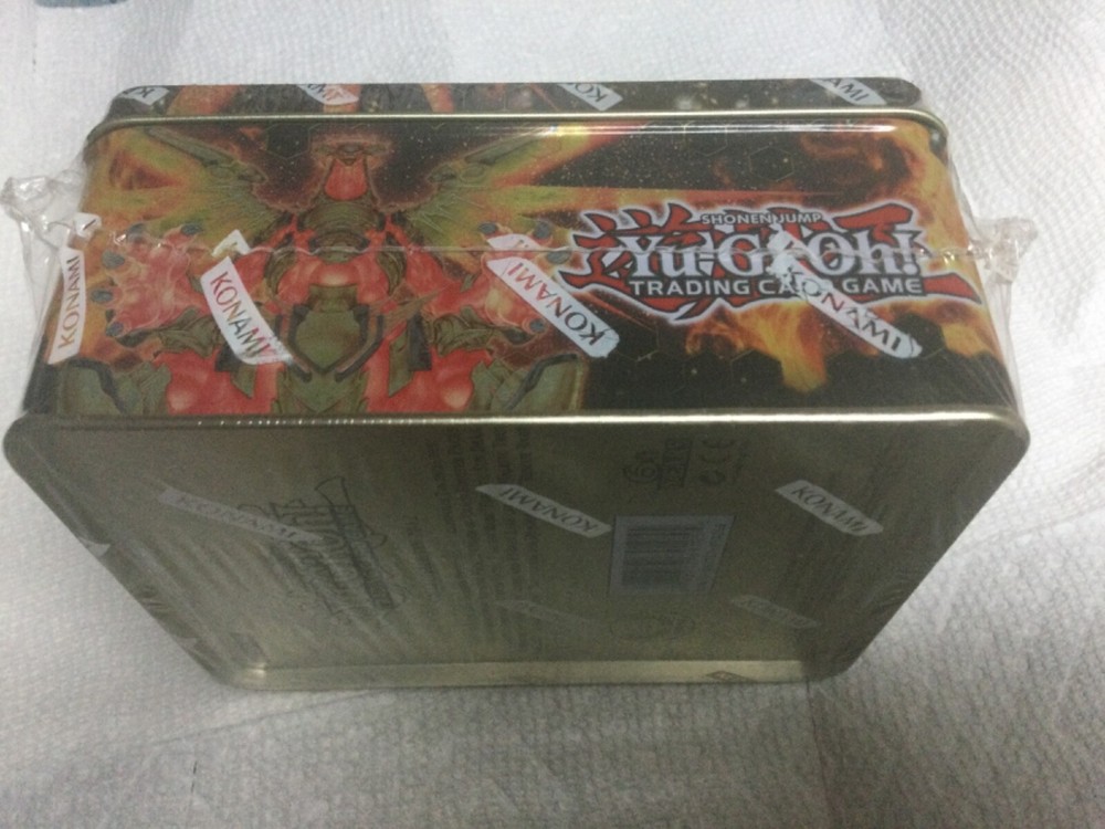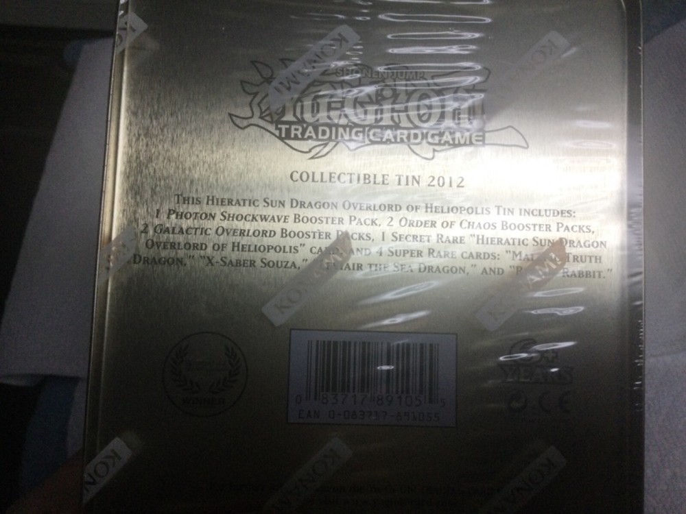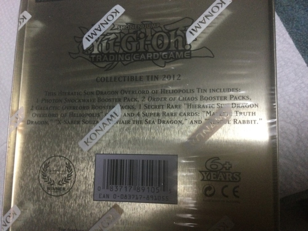 This is an USA Yu-Gi-Oh! TCG item from the 2012 Collectors Edition Tins, manufactured by Konami. It features the Hieratic Sun Dragon Overlord XYZ Card Along With Rescue Rabbit, Malefic Truth Dragon, X-Saber Souza, Leviair The Sea Dragon, 1 Photon Shockwave Booster Pack, 2 Order Of Chaos Booster Packs, 2 Galactic Overlord Booster Packs, and All comes in This collectors tin. The product is new and sealed.