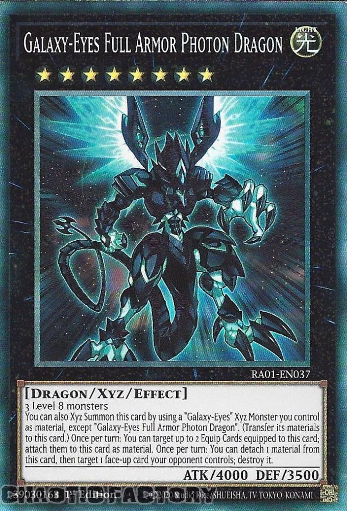 COLLECTOR'S Rare RA01-EN037 Galaxy-Eyes Full Armor Photon Dragon 1st Edition NM YU-GI-Oh! Product details (click to expand) Condtion Details NM Mint or Near mint LP Light Played, minor scatch or edge wear HP Heavy Played; very visible damages NOTE Refer to ebay's condition guide for further details Specifications (click to expand) SKU RA01-EN037-CR Model # Barcode # Brand YU-GI-Oh! Artist / Author Shipping Weight 0.0200kg Shipping Width 0.000m Shipping Height 0.000m Shipping Length 0.000m Shipping Cubic 0.000000000m3 Unit Of Measure ea Assembled Length 0.000m Assembled Height 0.000m Assembled Width 0.000m Type Format Delivery & Turn Around time (click to expand) Packing We always pack with toploader & soft sleeves Postage Method - Doemstic Standard Untracked Untrack letter post, delivery within 15 business days Domestic Tracked Tracked letter post, delivery within 15 business days with tracking Express Post Express Post; delivery after 2 to 3 business days after dispatch using AUSPOST's express network, exclusion applies; check auspost's website for details Turn Around time Dispatch 2 to 3 business days; which mean EXCLUDE WEEKEND © 2025 Chaotic Factory