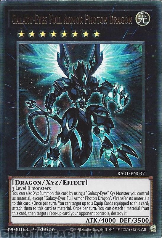 RA01-EN037 Galaxy-Eyes Full Armor Photon Dragon ULTRA Rare 1st Edition NM YU-GI-Oh! Product details (click to expand) Condtion Details NM Mint or Near mint LP Light Played, minor scatch or edge wear HP Heavy Played; very visible damages NOTE Refer to ebay's condition guide for further details Specifications (click to expand) SKU RA01-EN037-UR Model # Barcode # Brand YU-GI-Oh! Artist / Author Shipping Weight 0.0200kg Shipping Width 0.000m Shipping Height 0.000m Shipping Length 0.000m Shipping Cubic 0.000000000m3 Unit Of Measure ea Assembled Length 0.000m Assembled Height 0.000m Assembled Width 0.000m Type Format Delivery & Turn Around time (click to expand) Packing We always pack with toploader & soft sleeves Postage Method - Doemstic Standard Untracked Untrack letter post, delivery within 15 business days Domestic Tracked Tracked letter post, delivery within 15 business days with tracking Express Post Express Post; delivery after 2 to 3 business days after dispatch using AUSPOST's express network, exclusion applies; check auspost's website for details Turn Around time Dispatch 2 to 3 business days; which mean EXCLUDE WEEKEND © 2025 Chaotic Factory