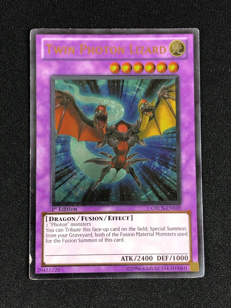 YUGIOH TWIN PHOTON LIZARD ORCS-EN039 1ST ULTIMATE PLAYED/EDGE WEAR ALL CARDS IN THIS AUCTION ARE IN NEAR MINT TO MINT CONDITION UNLESS STATED OTHERWISE IN THE TITLE. AND, YOU ARE GUARANTEED TO RECEIVE THE CARD NAMED IN THE TITLE. PLEASE NOTE, IF THERE'S MORE THAN 1 COPY AVAILABLE, YOU MAY NOT RECIEVE THE SAME EXACT CARD IN THE PHOTO. HOWEVER, IT WILL BE THE SAME EXACT CARD IN THE TITLE, AND DESCRIPTION! PLEASE CONTACT ME IF THERE IS ANYTHING WRONG WITH YOUR ORDER OR SHIPPING BEFORE LEAVING FEEDBACK. PLEASE GIVE ME A CHANCE TO FIX ANY PROBLEM YOU MAY HAVE. THANK YOU! Shipping Information: Shipping and Handling for this auction will be Free inside the United States - With Tracking! International Shipping Available Through Ebay’s Global Shipping Program. (BUYER IS RESPONSIBLE FOR ANY TAX) **Read the TITLE to see the condition of the cards Before you place a bid. Any damaged cards will be listed as such In The Title (FOR EXAMPLE: Blue Eyes White Dragon LOB-001 - Play/Edgewear). If it doesn't say anything about damage, it is in near-mint to mint condition. If you have any questions, message me Before you place your bid.** RETURN POLICY: RETURNS ARE ACCEPTED IF THE ITEM ARRIVES DAMAGED, OR NOT AS DESCRIBED. RETURNS ARE NOT ACCEPTED FOR BUYERS REMORSE. CHECK OUT MY OTHER AUCTIONS! _gsrx_vers_1516 (GS 9.3 (1516))