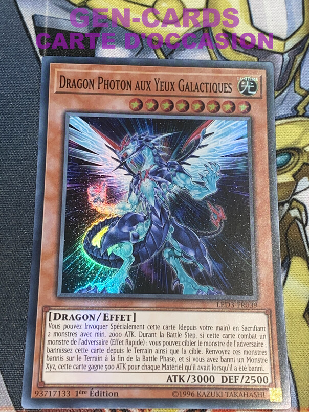 CARTE D'OCCASION. La qualité de la carte est indiquée dans la catégorie : Caractéristiques de l'Objet. Carte présentant des défauts mineurs, comme des rayures au dos plus ou moins importante ou des bords blancs ou autre. Cependant les cartes d'occasion peuvent être jouer. Pour les collectionneurs pointilleux évitez cette annonce. Peut être jouée en tournoi (*) sans problème. (*) Pour les tournois officiels il faut tenir compte de la BAN LIST ! Vous souhaitez regrouper vos achats et bénéficier du regroupement des frais de port. Attendez l'envoi de notre Facture. MODES DE PAIEMENT * FRANCE : Chèques, Paypal, Virement Bancaire. Si vous souhaitez venir retirer une commande dans notre magasin merci de nous en informer 24 heures à l'avance. Nous vous accueillons du : mardi au samedi : 10h00-12h00 14h30-19h00 le dimanche : 10h00-13h00 fermé le lundi GENERATION-80 292, rue Jules Guesde 62700 BRUAY LABUISSIERE ( Quartier de la Gare ) Tel : 03-21-56-98-76 * INTERNATIONAL BIDDER : Transfer Bank to UE ( virement bancaire international ), Paypal. MODES D'EXPEDITION * FRANCE : - Lettre Economique - Lettre Prioritaire - Lettre Suivie - Lettre Recommandée * INTERNATIONAL BIDDER : ~ Prioritaire ( sans numéro de suivi ) ~ Prioritaire avec assurance ( avec numéro de suivi ) Concernant les tarifs ils sont indiqués dans l'onglet : " Livraison et paiements " au dessus de cette description . Seuls les envois en Lettre Suivie ou en Lettre Recommandée garantissent une indemnisation en cas de problème. Dans le cas d'un envoi en Lettre simple, nous déclinons toute responsabilité en cas de perte ou détérioration lors de la livraison par la Poste.