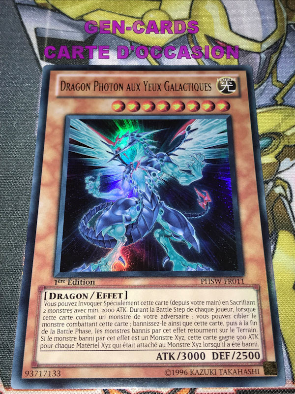 CARTE D'OCCASION. La qualité de la carte est indiquée dans la catégorie : Caractéristiques de l'Objet. Carte présentant des défauts mineurs, comme des rayures au dos plus ou moins importante ou des bords blancs ou autre. Cependant les cartes d'occasion peuvent être jouer. Pour les collectionneurs pointilleux évitez cette annonce. Peut être jouée en tournoi (*) sans problème. (*) Pour les tournois officiels il faut tenir compte de la BAN LIST ! Vous souhaitez regrouper vos achats et bénéficier du regroupement des frais de port. Attendez l'envoi de notre Facture. MODES DE PAIEMENT * FRANCE : Chèques, Paypal, Virement Bancaire. Si vous souhaitez venir retirer une commande dans notre magasin merci de nous en informer 24 heures à l'avance. Nous vous accueillons du : mardi au samedi : 10h00-12h00 14h30-19h00 le dimanche : 10h00-13h00 fermé le lundi GENERATION-80 292, rue Jules Guesde 62700 BRUAY LABUISSIERE ( Quartier de la Gare ) Tel : 03-21-56-98-76 * INTERNATIONAL BIDDER : Transfer Bank to UE ( virement bancaire international ), Paypal. MODES D'EXPEDITION * FRANCE : - Lettre Economique - Lettre Prioritaire - Lettre Suivie - Lettre Recommandée * INTERNATIONAL BIDDER : ~ Prioritaire ( sans numéro de suivi ) ~ Prioritaire avec assurance ( avec numéro de suivi ) Concernant les tarifs ils sont indiqués dans l'onglet : " Livraison et paiements " au dessus de cette description . Seuls les envois en Lettre Suivie ou en Lettre Recommandée garantissent une indemnisation en cas de problème. Dans le cas d'un envoi en Lettre simple, nous déclinons toute responsabilité en cas de perte ou détérioration lors de la livraison par la Poste.