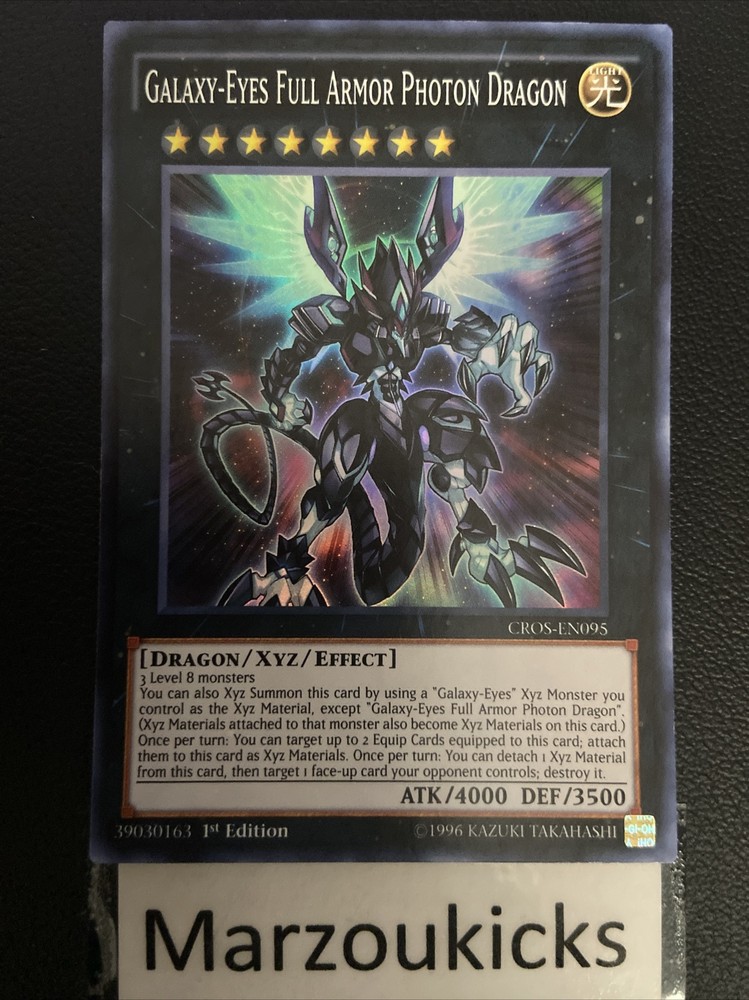 Yu-Gi-Oh - CROS-EN095 - GALAXY-EYES FULL ARMOR PHOTON DRAGON 1st Edition NM!. All orders under $20 will ship with EBay standard envelope. All orders over $25 will include tracking. All cards are mailed with protected top loader. Cards with single pictures are Mint or Near Mint condition. Flaws will be present in pictures post. If you have any questions or concerns please message me and I will respond as soon as possible. If additional pictures are needed please contact me. Condition: Will have condition listed in the title. However, if you have question or need additional pictures please contact me. We do our best to answer all message. Return: If there’s an issue with your order please contact me first. I will do my best to correct any errors or issues. Shipping: Will typically ship the next day, unless it’s a weekend and in that case cards will be shipped on Monday.
