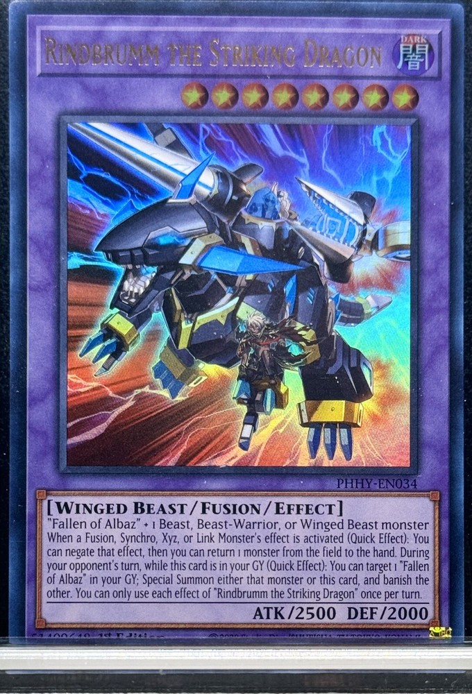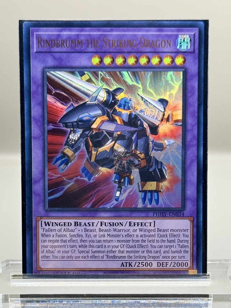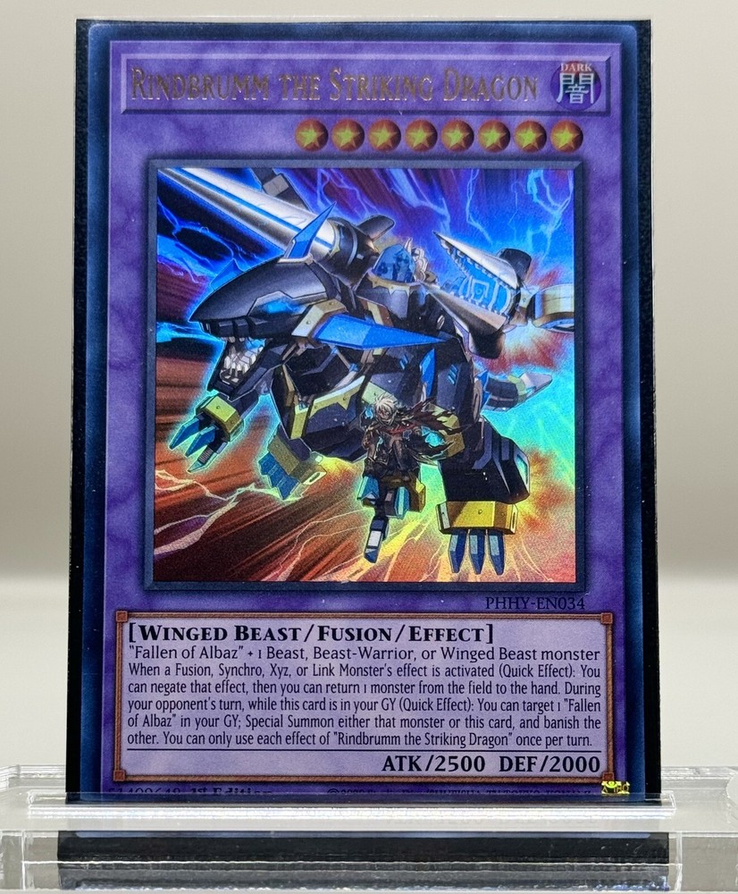 This Japanese card from the Photon Hypernova set is a must-have for any Yu-Gi-Oh! TCG collector. With a powerful attack of 2500 and a tough defense of 2000, Rindbrumm the Striking Dragon is a Winged Beast that can dominate the field. This Ultra Rare card is a 1st Edition and in top-notch condition, making it perfect for players and collectors alike. Its Attribute is Dark and its Card Type is Beast. The Card Number is PHHY-EN034, and it's manufactured by Konami. Don't miss the opportunity to add this amazing card to your collection! - Card(s) come double-sleeved - Never played; pac kto sleeve - Near mint or better *Due to multiple copies, the one(s) received may not match image* *Shipping cost includes packing supplies* - Color-coded sleeve(s) - Top loader - Cardboard sleeve - Stay flat Cardboard mailer