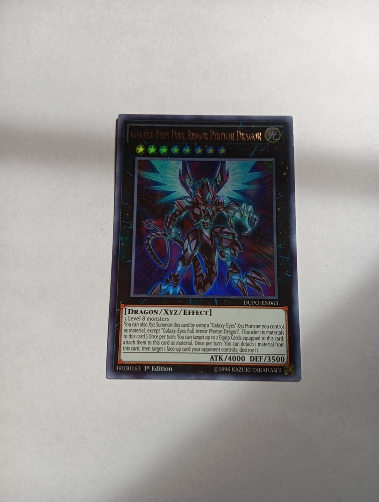This Yu-Gi-Oh! TCG card features the powerful Galaxy-Eyes Full Armor Photon Dragon, with 4000 attack and 3500 defense. It is a rare and sought-after Ultra Rare card, with a 1st Edition status. The card number is DUPO-EN063, and it belongs to the Duel Power set. The card is of the Xyz/Effect Monster type, with the Dragon creature/monster type. It features the Armor character, and is perfect for collectors and fans of the game. Get your hands on this amazing card and add it to your collection today!