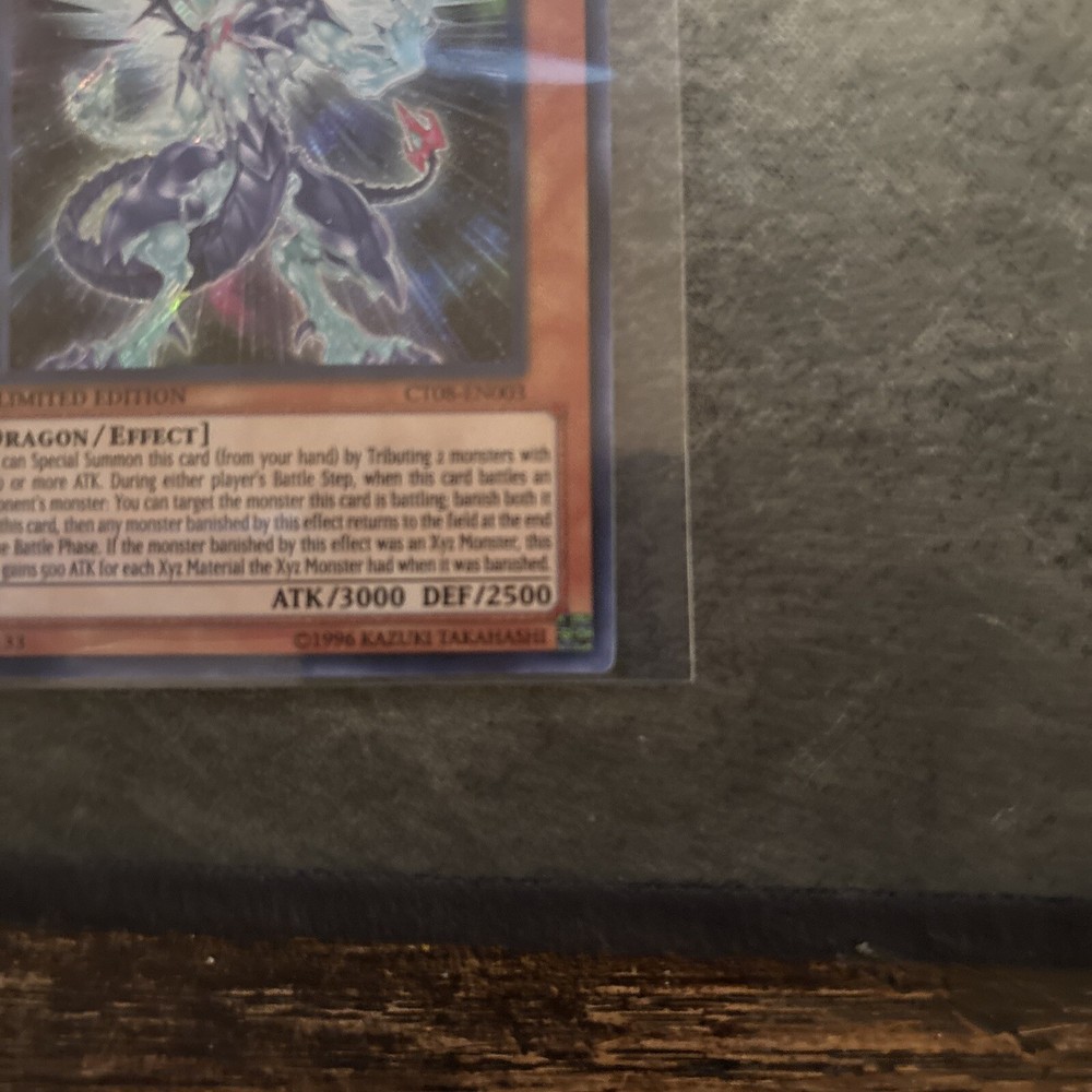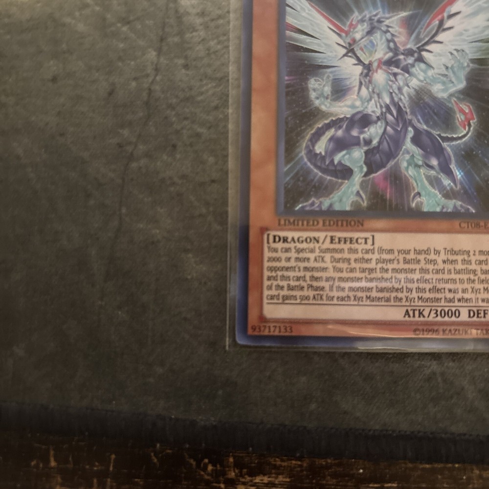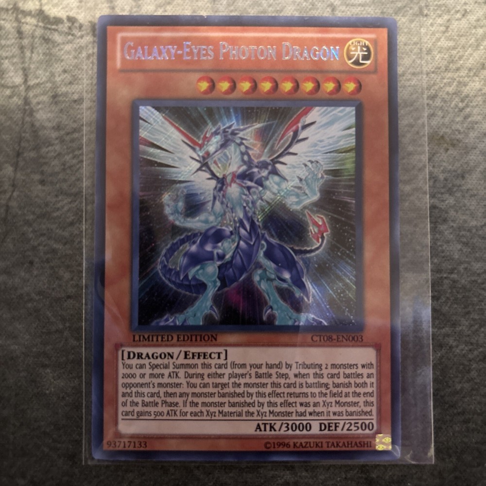 This Yu-Gi-Oh! TCG card is a Limited Edition Galaxy-Eyes Photon Dragon from the 2011 Collectors Tins set. With a powerful Attack/Power of 3000 and Defense/Toughness of 2500, it's a must-have for any fan of the game. The card features an Effect type and is classified as a Secret Rare with the card number Ct08-En003. In addition to its impressive stats, this card boasts a striking Light-colored design with a Dragon creature/monster type. It's perfect for collectors and players alike, and is sure to stand out in any collection. Don't miss out on the chance to own this rare and powerful card!