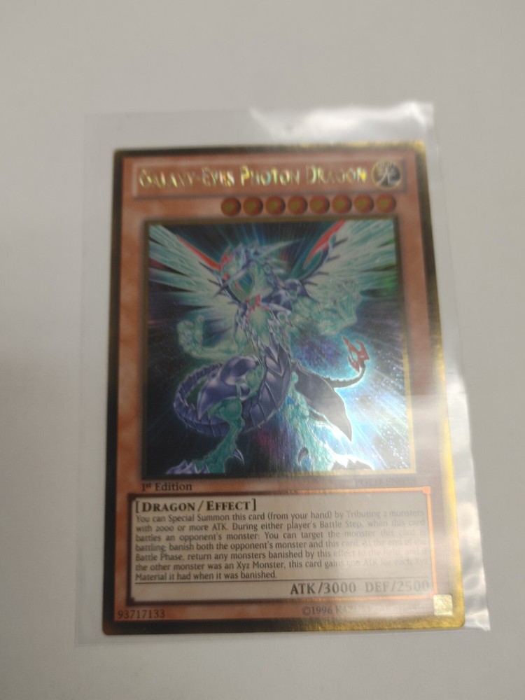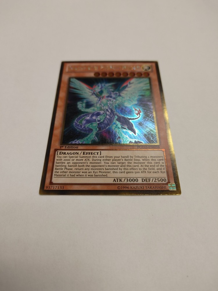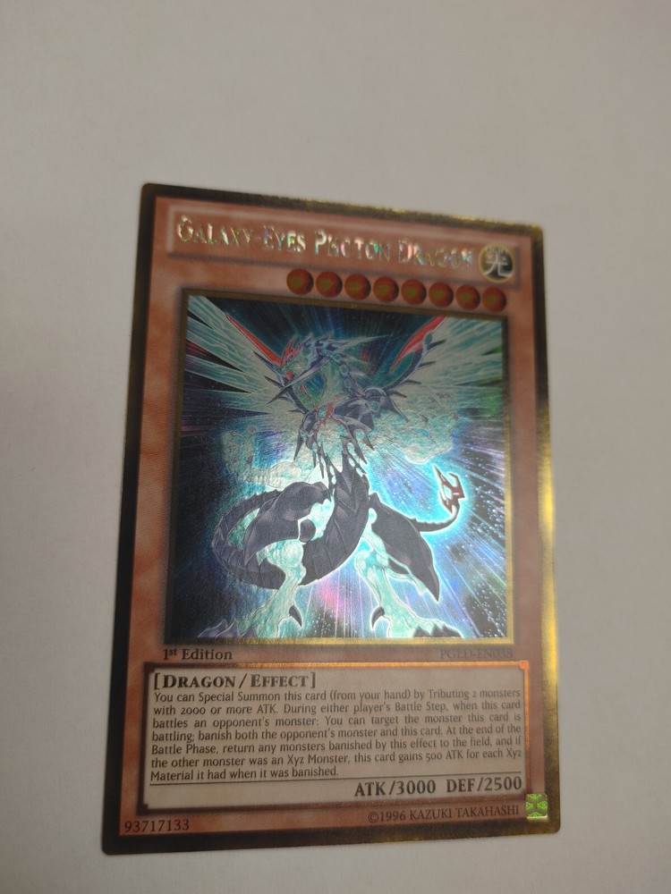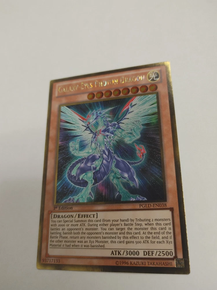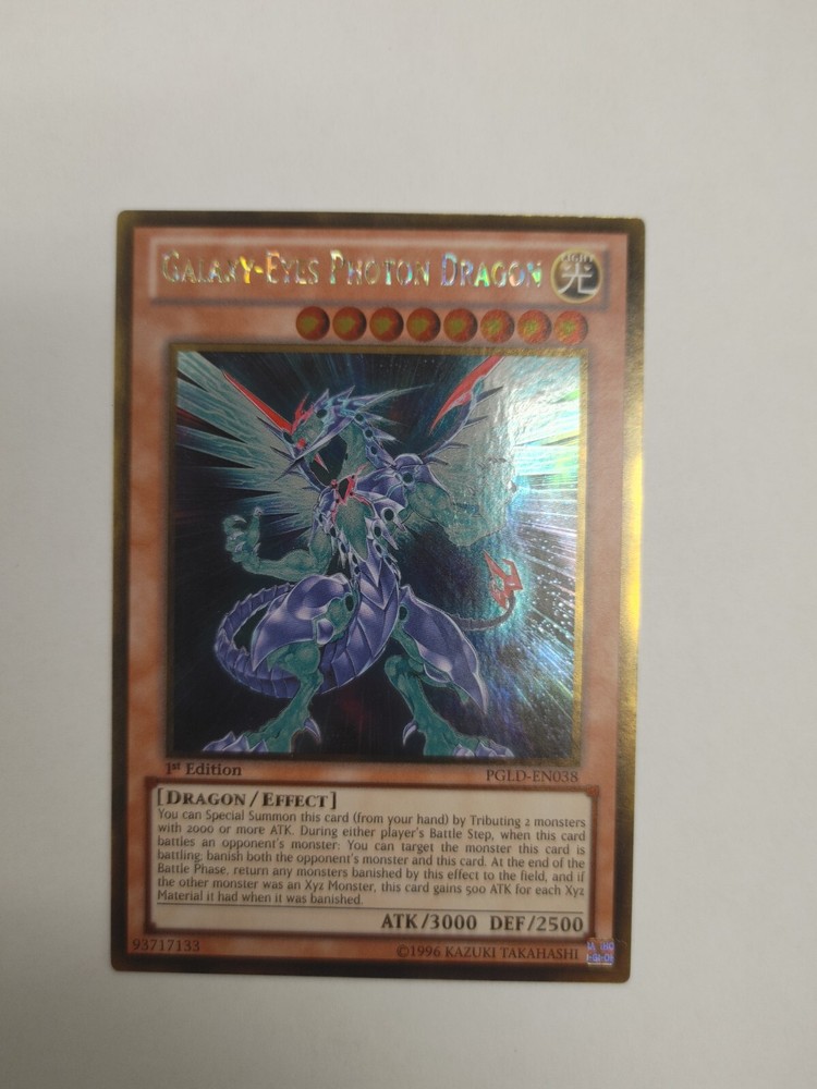 For the Yu-Gi-Oh! TCG enthusiasts, here's your chance to own the highly sought-after Galaxy-Eyes Photon Dragon Premium Gold PGLD-EN038 1st Edition Gold card. This powerful Dragon/Effect monster with 3000 Attack/Power and 2500 Defense/Toughness belongs to the Premium Gold set and is in near-mint or better condition, ready to enhance your collection. With its unique attributes and features such as 1st Edition gold rarity, this card is a must-have for any Yu-Gi-Oh! TCG player. Don't miss out on the opportunity to add Galaxy-Eyes Photon Dragon to your deck today.