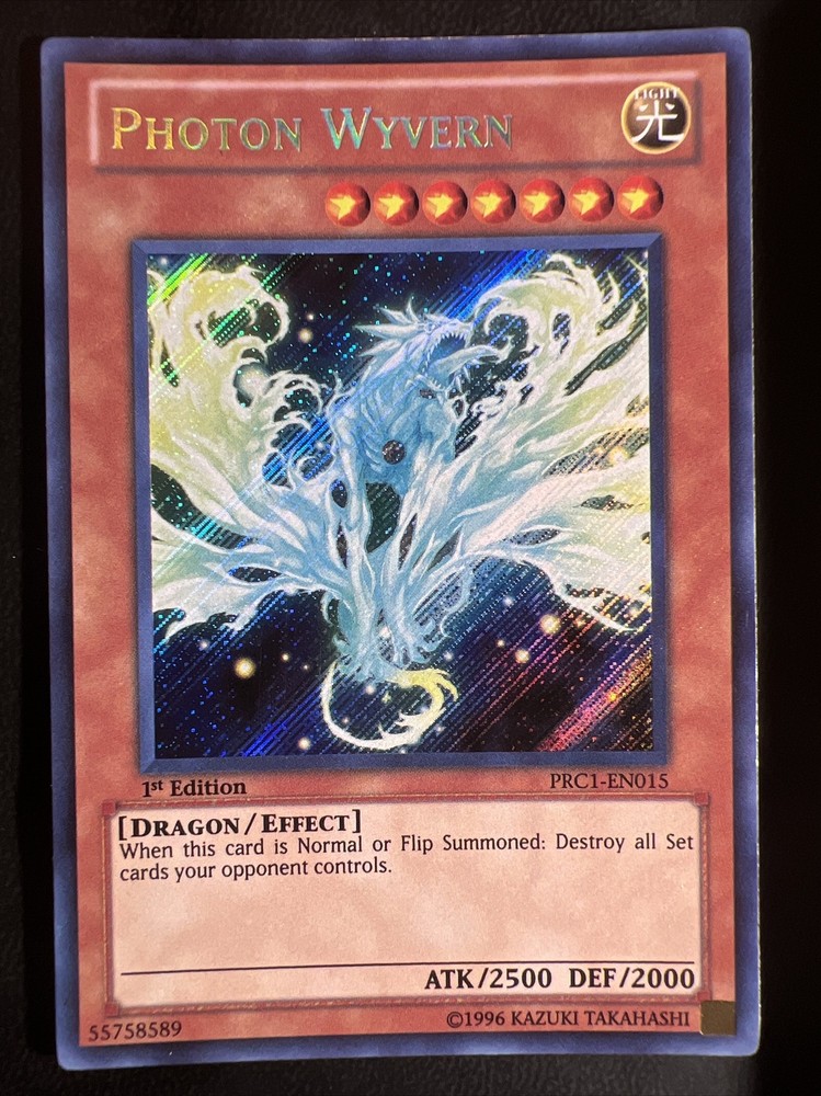 Own this rare and powerful Yu-Gi-Oh! TCG card, Photon Wyvern, from the 2012 Premium TiN set. This secret rare card boasts an impressive attack power of 2500 and a defense toughness of 2000, making it a must-have for any serious collector or player. Its dragon monster type and light color attribute make it a unique addition to any deck. The card is near mint or better and is a 1st edition, adding to its rarity. Don't miss out on the opportunity to own this amazing card. Buy multiple cards or item and save with combined shipping. MUST MESSAGE SELLER BEFORE CHECKOUT to receive combined shipping discount!! All cards shipped securely with sleeve and top loader. Please checkout my eBay store CardShark. New cards being added daily. Shipping usually within 1-2 days of payment. Please contact me immediately if there is ever an issue with a purchase. It will be remedied ASAP. If you are happy with a purchase please feel free to FOLLOW my store CardShark and leave some positive feedback. Thanks for shopping at CardShark and have an amazing day.