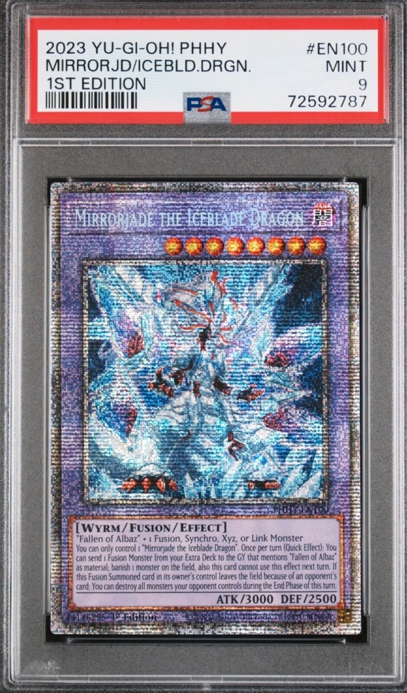The product is a Yugioh 2023 Mirrorjade the Iceblade Dragon card from the Photon Hypernova set. This 1st Edition Starlight Rare card features a Dark attribute, Wyrm creature type, and Fusion Monster stage. Manufactured by Konami, the English-language card has a foil finish and belongs to the Fusion/Effect specialty category. With a PSA 9 grade, this collectible card is suitable for ages 6 and up and is a valuable addition to any Yu-Gi-Oh! TCG collection.