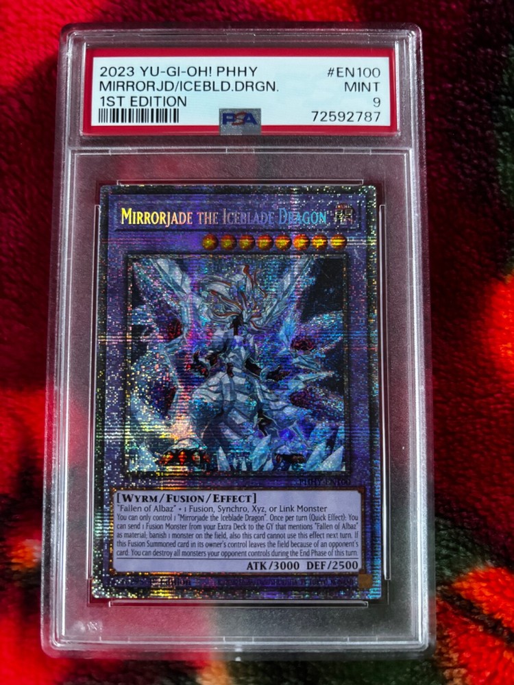 This stunning Starlight Rare Mirrorjade card is a must-have for serious collectors! The icy holographic artwork pops beautifully, and the PSA 9 grade ensures premium condition. As a powerful Fusion monster from Photon Hypernova, it's both playable and display-worthy. The 1st Edition stamp adds extra collectibility, making this a fantastic investment piece that stands out in any Yu-Gi-Oh! collection.
