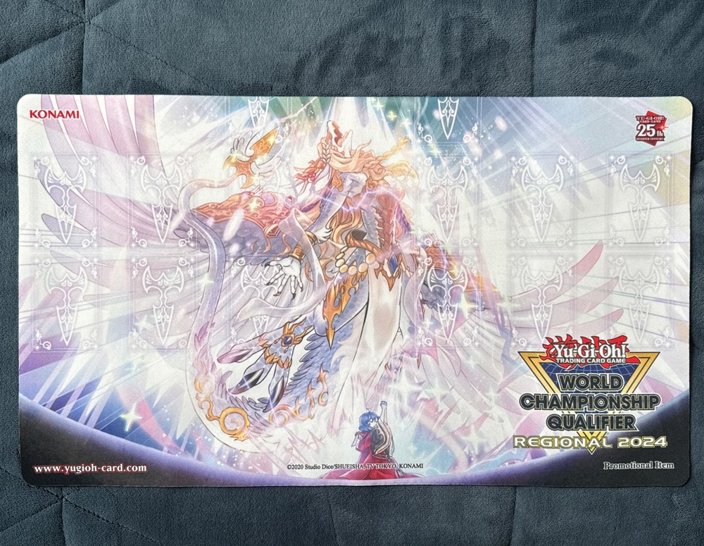 The product is a 2023 Yu-Gi-Oh! CCG playmat featuring Photon Hypernova. It is a Multicolor rubber playmat with a standard size suitable for ages 6 and up. The design includes the Photon Hypernova 2023 WCQ Regional character from the Yu-Gi-Oh! franchise. This playmat is part of the Yu-Gi-Oh! TCG game manufactured by Konami.