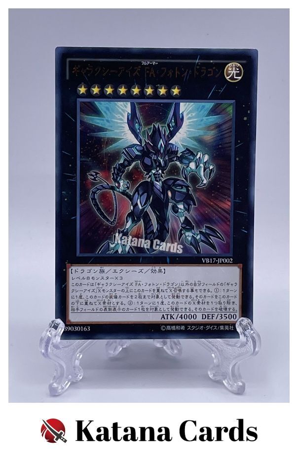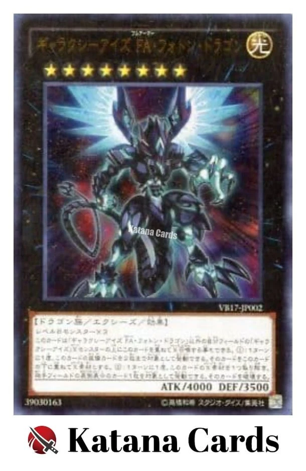 Yugioh Cards | Galaxy-Eyes Full Armor Photon Dragon Ultra Rare | VB17-JP002 Japa C ondition Near Mint to Excellent Yugioh Cards Check our Yugioh cards here. D iscounts!!! Buy more than 3 cards in my store, Save $2 for each cards. Buy 3 cards, save $6 altogether. Buy 4 cards, save $8 altogether. Buy 5 cards, save $10 altogether and so on. Yugioh Cards Check our Yugioh cards here. Discounts are applied automatically by simply adding the product to your cart! S hipping We usually ship within 3 - 5 business days of receiving cleared payment. Economy Shipping - No Tracking Number - It takes 7 - 30 days after shipment. Expedited Shipping - Tracking Number - It takes 3 - 10 days after shipment. If you buy more than 2 cards and choose Expedited Shipping, please select Expedited Shipping for just 1 item. We will ship the items in one package. P ayment We can be contacted at any time through eBay messages if you have any questions, comments or product requests. We will respond to you within 24 hours and do our best to help you out! We encourage our customers to contact us with any questions or concerns! We'd like to be sure you are completely satisfied with your purchase. We do not mark merchandise values below value or mark items as gifts. US and International government regulations prohibit such behavior. I nternational Buyers - Please Note Import duties, taxes, and charges are not included in the item price or shipping cost. These charges are the buyers responsibility. Please check with your country's customs office to determine what these additional costs will be prior to bidding or buying.