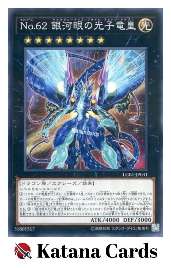 Yugioh Cards | Number 62: Galaxy-Eyes Prime Photon Dragon Parallel Rare | LGB1-JP C ondition Near Mint to Excellent Yugioh Cards Check our Yugioh cards here. D iscounts!!! Buy more than 2 cards in my store, Save 3 - 5% off for each cards. Yugioh Cards Check our Yugioh cards here. Discounts are applied automatically by simply adding the product to your cart! If the discount is not applied automatically due to eBay's system error, please inform us of the "Discount Error" in the message after purchasing the item. We will manually apply the discount based on the number of items purchased. S hipping We usually ship within 3 - 5 business days of receiving cleared payment. Economy Shipping - No Tracking Number - It takes 7 - 30 days after shipment. Expedited Shipping - Tracking Number - It takes 3 - 10 days after shipment. If you buy more than 2 cards and choose Expedited Shipping, please select Expedited Shipping for just 1 item. We will ship the items in one package. P ayment We can be contacted at any time through eBay messages if you have any questions, comments or product requests. We will respond to you within 24 hours and do our best to help you out! We encourage our customers to contact us with any questions or concerns! We'd like to be sure you are completely satisfied with your purchase. We do not mark merchandise values below value or mark items as gifts. US and International government regulations prohibit such behavior. I nternational Buyers - Please Note Import duties, taxes, and charges are not included in the item price or shipping cost. These charges are the buyers responsibility. Please check with your country's customs office to determine what these additional costs will be prior to bidding or buying.