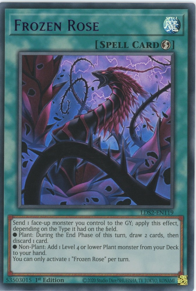 Yugioh Frozen Rose LDS2-EN119 Ultra Rare Purple1st Edition NR Mint You can find more Yu-Gi-Oh cards of all value and rarity in our other listings All cards are in excellent condition unless stated otherwise and the photos are of cards we own but may not be the exact card you receive due to the quantities listed.