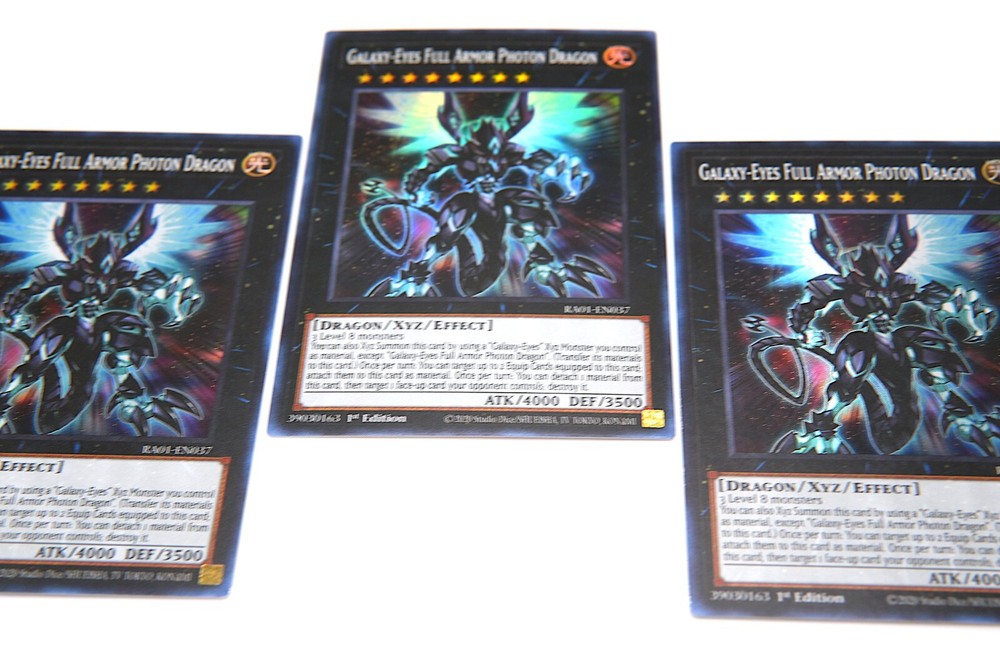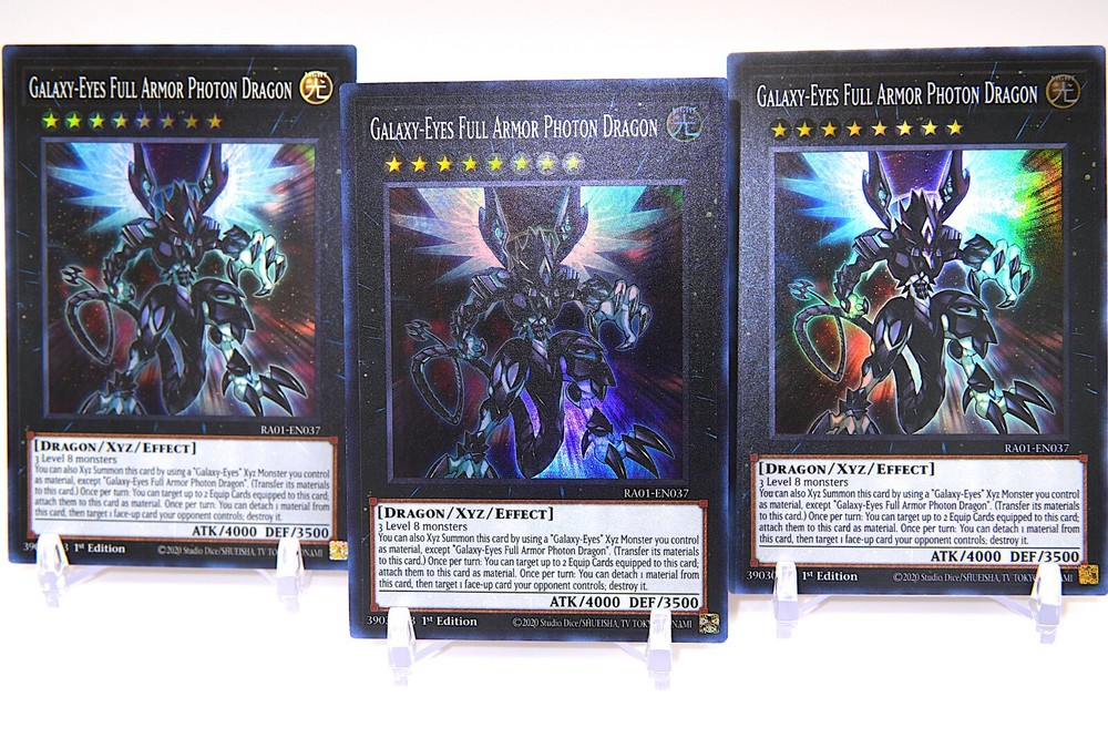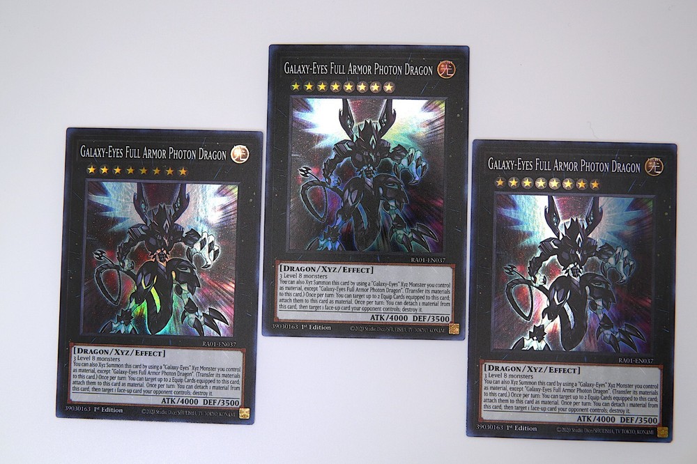 3x Yugioh Galaxy-Eyes Full Armor Photon Dragon - RA01-EN037 - Super Rare - 1st Ed. You will get 3 Copies of Galaxy-Eyes Full Armor Photon Dragon (1st Ed.) Yugioh 25th Anniversary Rarity Collection (RA01-EN037) Super Rare M/NM condition This Yugioh Galaxy-Eyes Full Armor Photon Dragon playset contains 3x Ultra Rare (RA01-EN037) card from the Yu-Gi-Oh! TCG. The card's rarity is Super Rare, making it a highly sought-after collectible item for fans of the game. The card is in near mint or better condition, and is a 1st Edition. This playset is perfect for collectors and players alike who are looking to expand their Yugioh card collection. Add Galaxy-Eyes Full Armor Photon Dragon card to your deck or showcase it in your collection today! All cards are in M/NM condition. - 100% AUTHENTIC KONAMI YUGIOH CARDS - THESE CARDS HAVE ALL BEEN KEEP IN BINDERS, BOXES, OR CARD SLEEVES. PAYMENT and SHIPPING: - We securely ship all packages within 24 hours of received payment through PayPal. - Purchases must be paid within 24 hours . International shipping: USPS First Class International Mail expect 2-4 weeks for delivery. International Buyers-Please Note: Import duties, taxes, and charges are not included in the item price or shipping cost. These charges are the buyer's responsiblity. Please check with your country's customs office to determine what these additional costs will be prior to bidding or buying. THANK YOU FOR LOOKING :)