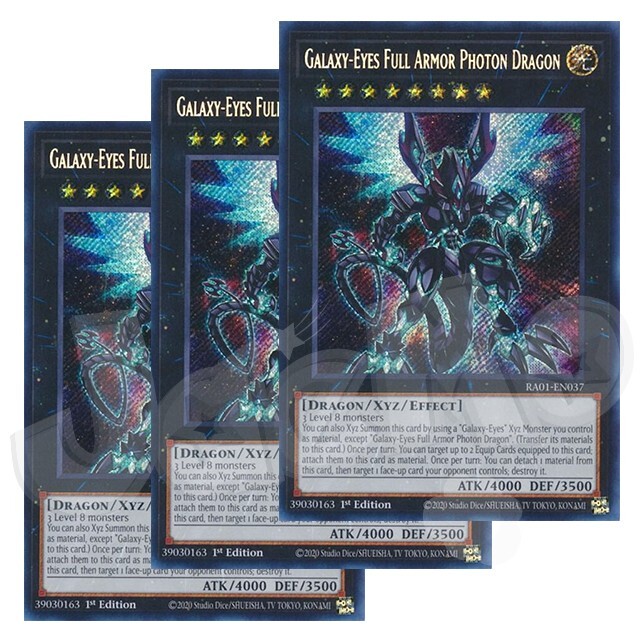 Galaxy-Eyes Full Armor Photon Dragon x 3 1st Edition - Secret Rare The cards are in NM condition. Also will include a free Holographic card which can be a rarity of Super, Ultra, Secret, etc! Card Information 3 Level 8 monsters You can also Xyz Summon this card by using a "Galaxy-Eyes" Xyz Monster you control as material, except "Galaxy-Eyes Full Armor Photon Dragon". (Transfer its materials to this card.) Once per turn: You can target up to 2 Equip Cards equipped to this card; attach them to this card as material. Once per turn: You can detach 1 material from this card, then target 1 face-up card your opponent controls; destroy it. Number: RA01-EN037 Rarity: Secret Rare