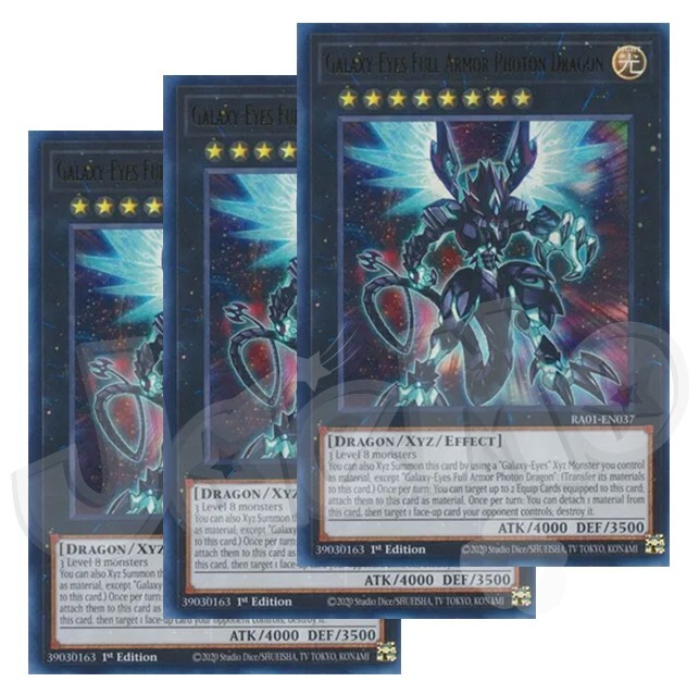 Galaxy-Eyes Full Armor Photon Dragon x 3 1st Edition - Ultra Rare The cards are in NM condition. Cards will be placed in a sleeve and top loader for security. Also will include a free Holographic card which can be Super, Ultra, Secret, etc! Card Information RA01-EN037 - 1st Edition - Ultra Rare 25th Anniversary Rarity Collection