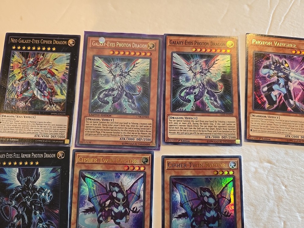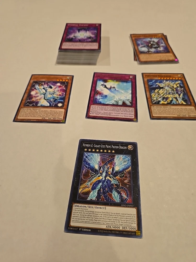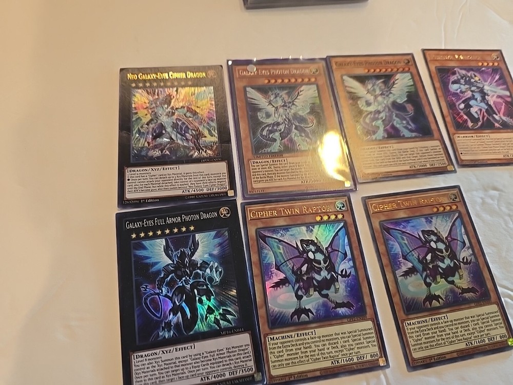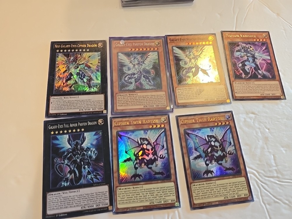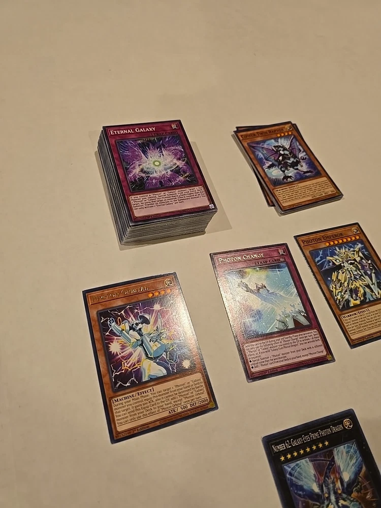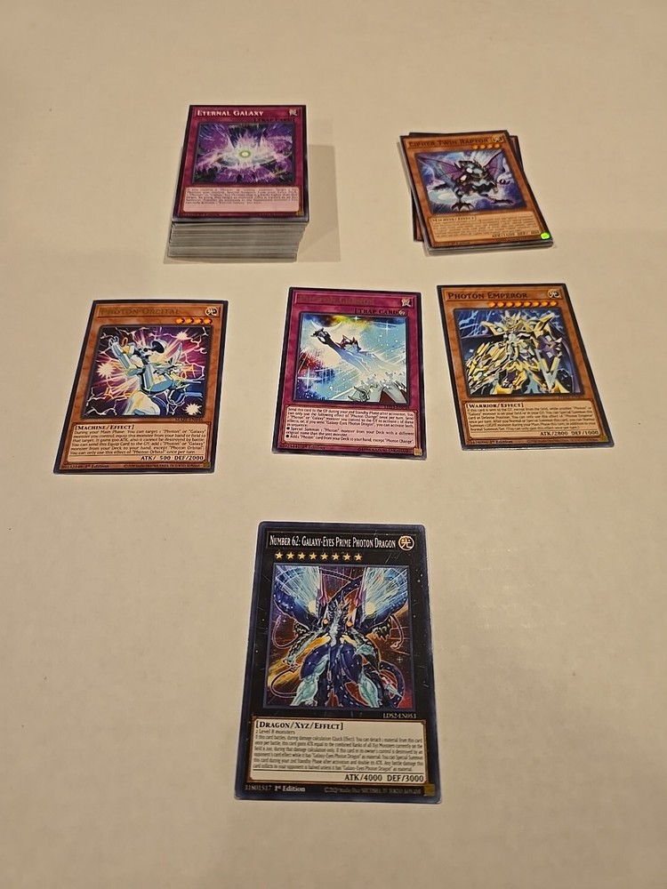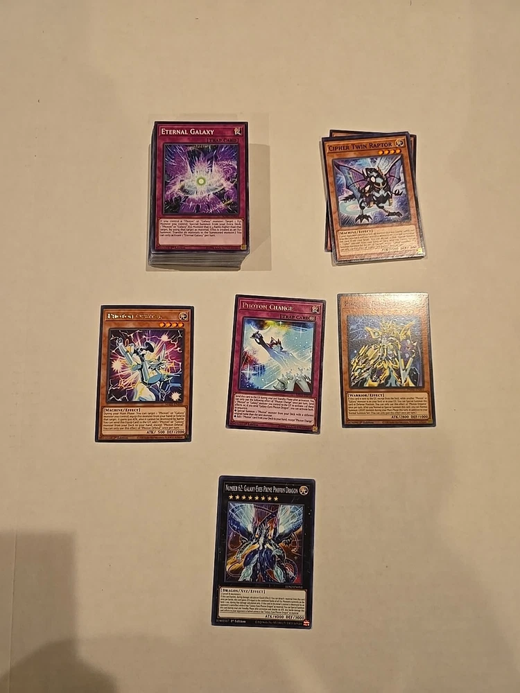 Kite themed common lot including galaxy, photon and Cipher cards Around 100 cards Near mint mostly There are TONS of duplicates, maybe half the lot is duplicates, PLEASE BE AWARE BEFORE BUYING!! TOTAL: 89 cards 1 Photon Crusher[] 1 Number 62: Galaxy-Eyes Prime Photon Dragon [LDS2] 1 Cipher Twin Raptor [INOV] 1 Cipher Twin Raptor [INOV] 1 Double Cipher [INOV] 1 Double Cipher [INOV] 1 Galaxy Cleric [SOFU] 1 Galaxy Dragon [MP15] 1 Photon Trident [ORCS] 1 Galaxy Queen's Light [REDU] 1 Galaxy Mirror Sage [PRIO] 4 Galaxy Serpent [YS17] 1 Accellight [LED3] 1 Galaxy Storm [ORCS] 6 Galaxy Storm [ORCS] 1 Photon Orbital [MAZE] 3 Photon Orbital [MAZE] 1 Cipher Etranger [MP17] 1 Cipher Etranger [RATE] 1 Galactic Charity [MP15] 1 Cipher Mirror Knight [MP17] 1 Photon Change [LED3] 1 Photon Emperor [PHHY] 9 Photon Emperor [PHHY] 2 Cipher Bit [DPDG] 2 Galactic Spiral Dragon [CHIM] 3 Rank-Up-Magic Cipher Ascension [RATE] 1 Double Cipher [DPDG] 1 Double Cipher [DPDG] 1 Eternal Galaxy [MP19] 1 Eternal Galaxy [SOFU] 4 Eternal Galaxy [SOFU] 1 Cipher Bit [INOV] 1 Cipher Mirror Knight [INOV] 1 Photon Crusher [ORCS] 1 Cipher Wing [DPDG] 1 Cipher Mirror Knight [DPDG] 3 Galaxy Worm [COTD] 1 Photon Sabre Tiger [EGO1] 7 Photon Timestop [PHHY] 15 Numeron Creation [PHHY] 1 Cipher Spectrum [DPDG]