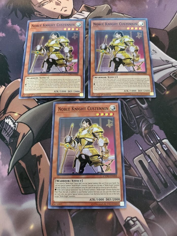 Free eBay listing template designed by dewiso.com Yugioh - Noble Knight Custennin CYHO-EN088 NM Unlimited/1st ed Super Rare x3 Product This a Yugioh Product that is being sold! Condition is exactly as pointed out in title. For you're reference: NM: Near Mint VLP: Very Lightly Played LP: Lightly Played MP: Moderately Played HP: Heavily Played Shipping This listing will be shipped via card sleeve/penny sleeve and a top loader via letter mail. If you are purchasing an order of over $150 I will provide shipping with tracking free! Contact If you have any questions whether it be more pictures of the back or clarification on an order please contact me! We will do everything to Help! Also if you have multiple items or even have specific things you are looking for, reach out and we might just have it! There are no refunds, items are final sale! If the item has been incorrectly described or wrongly sent, please send images and we will sort it out right away! If the product has X2 or X3, it means it will either come with 2 of the same card or 3 of the same card. Be sure to always check the title of the listing! Great quality products that we ship across North America! Be sure to leave a review when you receive the item! Collection and Bulk Pokemon/Yugioh Purchases If you have any collections or bulk cards that you wish to sell please contact me and send pictures of what you're looking to sell! Rates: Contact me for rates! Reminder: I am looking to make profit when buying and selling, so please when reaching out realize that we both have to profit off the transaction!