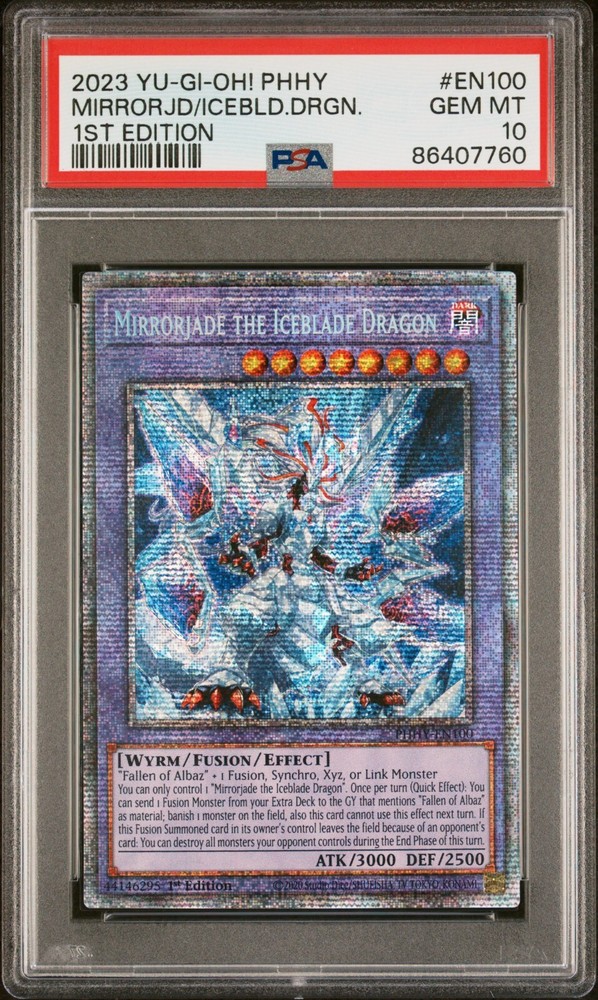 You are bidding on a Yugioh PSA 10 GEM MT Mirrorjade the Iceblade Dragon PHHY-EN100 Starlight Rare 1st Edition from Photon Hypernova!! This card has been graded as GEM MINT - a 10 - by PSA!!! An excellent addition to any collection! Shipping is FREE on this item in the United States! All PSA cards will be shipped in a padded envelope or appropriately sized padded box, with a graded card sleeve surrounding the PSA Case. For orders over $250, please be advised that signature confirmation is required. For any questions regarding shipping or otherwise, please contact us prior to purchase. Please allow 2-3 business days handling time. Make sure to check out our other listings for all of your favorite Trading Card Games! Thanks for shopping at Yeti Gaming!
