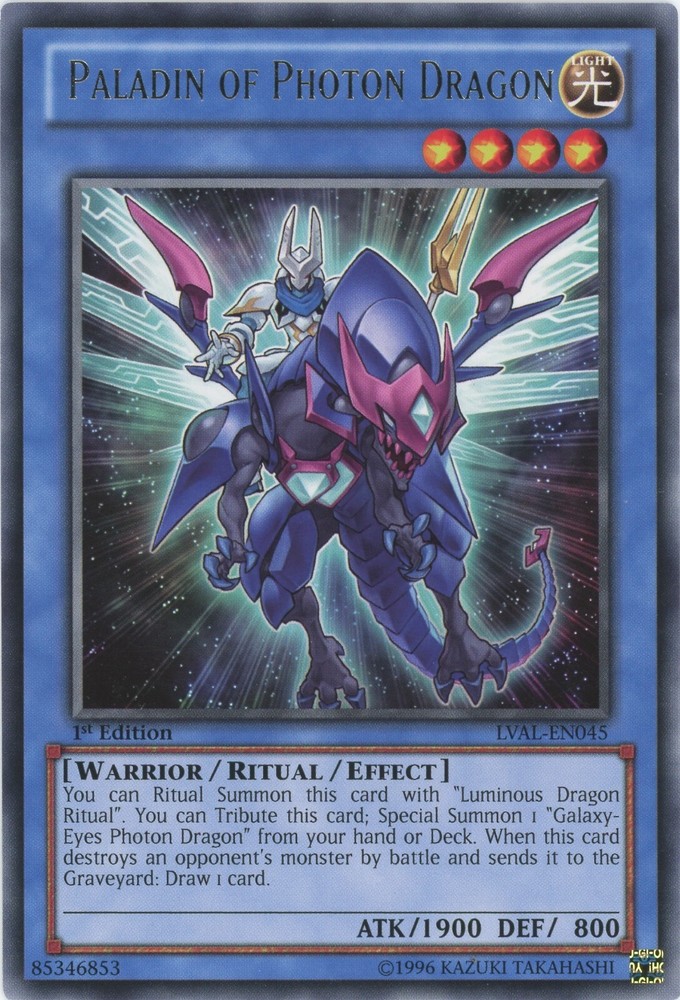 Yugioh Paladin Of Photon Dragon LVAL-EN045 Rare LP You can find more Yu-Gi-Oh cards of all value and rarity in our other listings All cards are in excellent condition unless stated otherwise and the photos are of cards we own but may not be the exact card you receive due to the quantities listed.