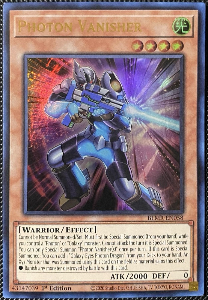 Product Details Cannot be Normal Summoned/Set. Must first be Special Summoned (from your hand) while you control a "Photon" or "Galaxy" monster. Cannot attack the turn it is Special Summoned. You can only Special Summon "Photon Vanisher(s)" once per turn. If this card is Special Summoned: You can add 1 "Galaxy-Eyes Photon Dragon" from your Deck to your hand. An Xyz Monster that was Summoned using this card on the field as material gains this effect. • Banish any monster destroyed by battle with this card. Number:BLMR-EN058 Rarity:Ultra Rare Attribute Monster Type/Card Type:LIGHT Warrior/Effect Monster Level:4 A / D:2000 / 0