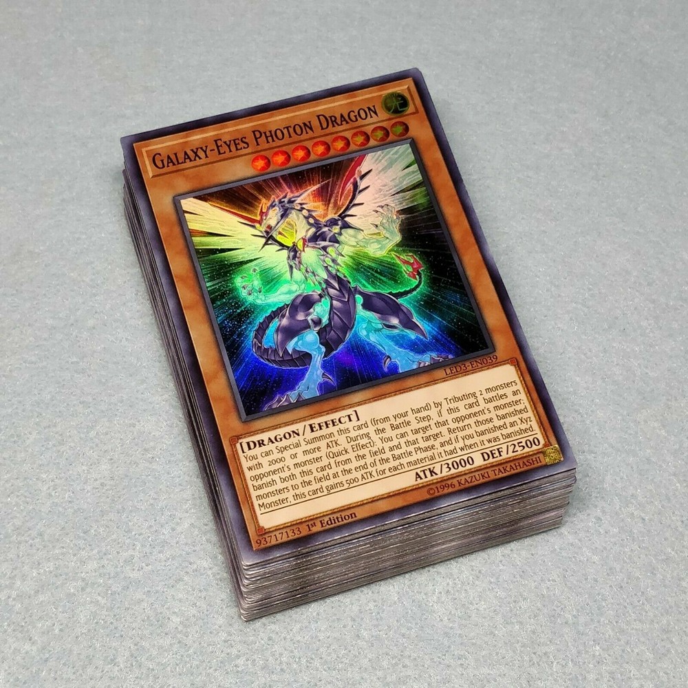 Hello all I am a New Ebay Seller!!! I am a Female Yugioh & Magic Collector!!! Happy Bidding!!! A bonus for ordering you will also Get a Free Holo Card from my collection. It maybe Super Rare, Ultra Rare, or SECRET Rare!!! Picture may have been edited due to Inventory Changes Please read description Below Item for sale is: Monster (25): 1 Galaxy Eyes Photon Dragon 1 Galaxy Tyranno 2 Galaxy Serpent 1 Photon Wyvern 1 Photon Thrasher 1 Photon Cerberus 2 Photon Circle 2 Photon Leo 1 Photon Lizard 3 Photon Crusher 1 Overlay Booster 1 Overlay Sentinel 3 Kuriphoton 2 Plasma Ball 1 Reverse Buster 1 Dimension Wanderer 1 Paladin of Photon Dragon Spell (9): 3 Accellight 1 Galaxy Storm 1 Galaxy Queen’s Light 2 Galaxy Wave 1 Photon Veil 1 Luminous Dragon Ritual Trap (8): 3 Photon Change 3 Eternal Galaxy 2 Double Dragon Descent Extra (3): 1 Galaxy Eyes Full Armor Photon Dragon 1 Neo Galaxy Eyes Cipher Dragon 1 Starliege Paladynamo